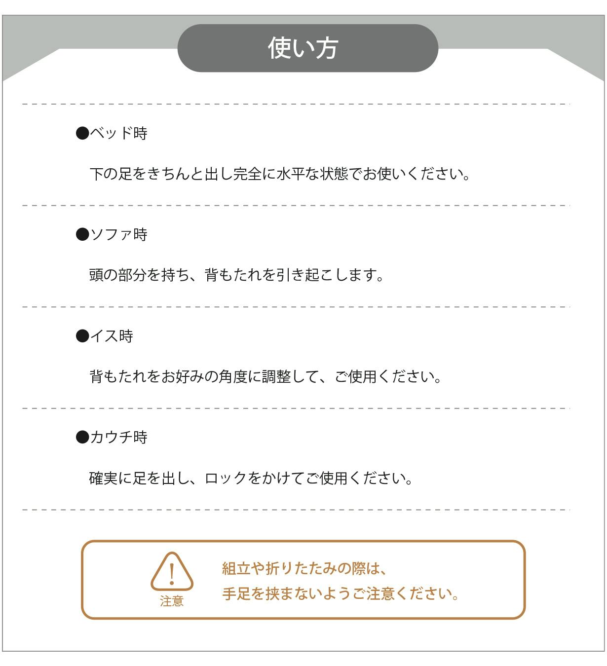 折りたたまれた状態(オットマン時)でも、伸ばした状態(カウチ&ベッド時)でも、自分に合った体制でしっかり機能する独自の折りたたみ構造。