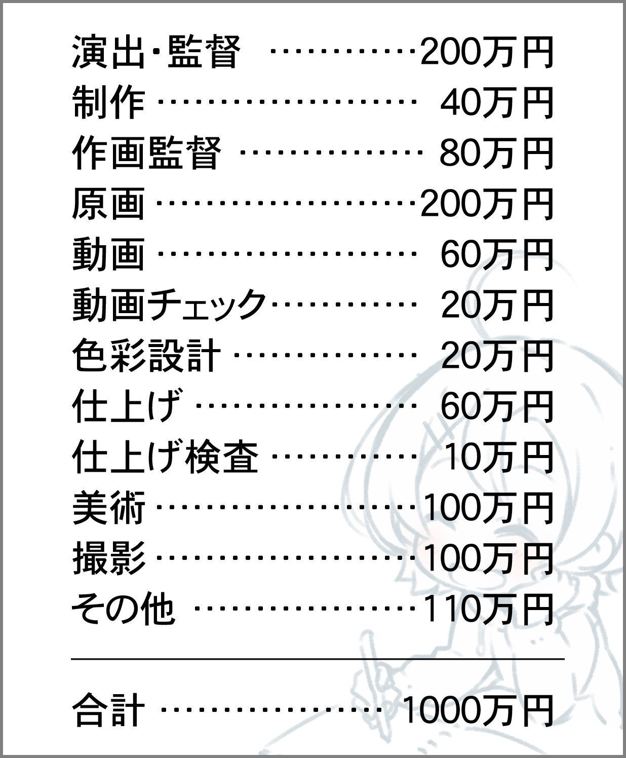 第二作目の今回は、可能であればアニメーターさんに「単価」による支払いだけではなく「拘束料」などの固定給の支払いも出来る段階に移行したいと考えております。