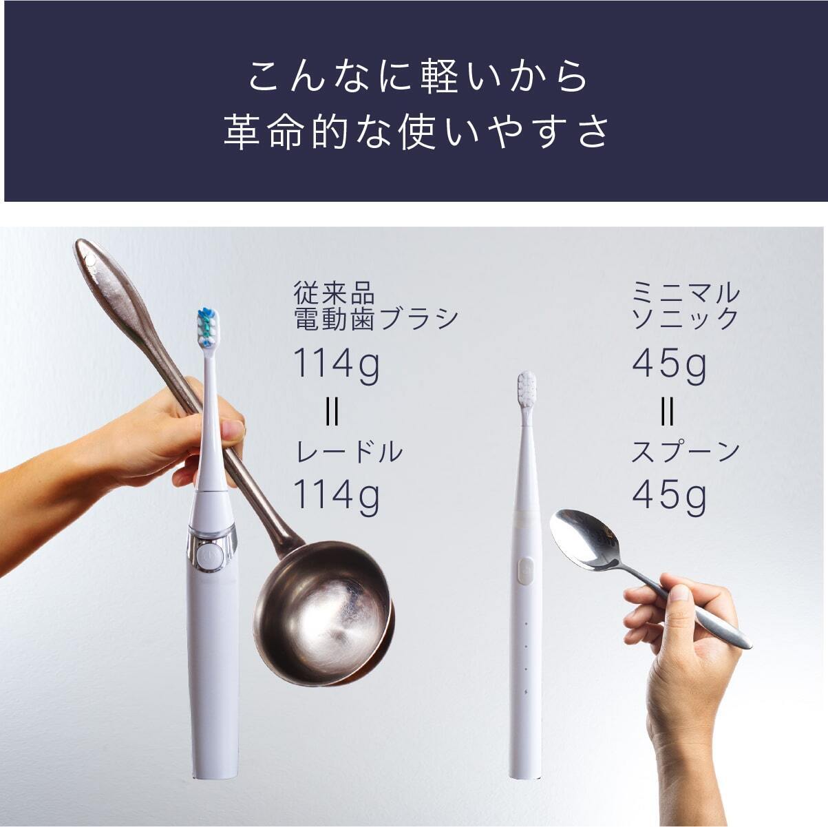 レードル(おたま)の重量は114g、これは従来の電動歯ブラシと同じです。スプーンの重量は45g、これがミニマルソニックと同じです。こんなに軽いから革命的な使いやすさを実現しました。