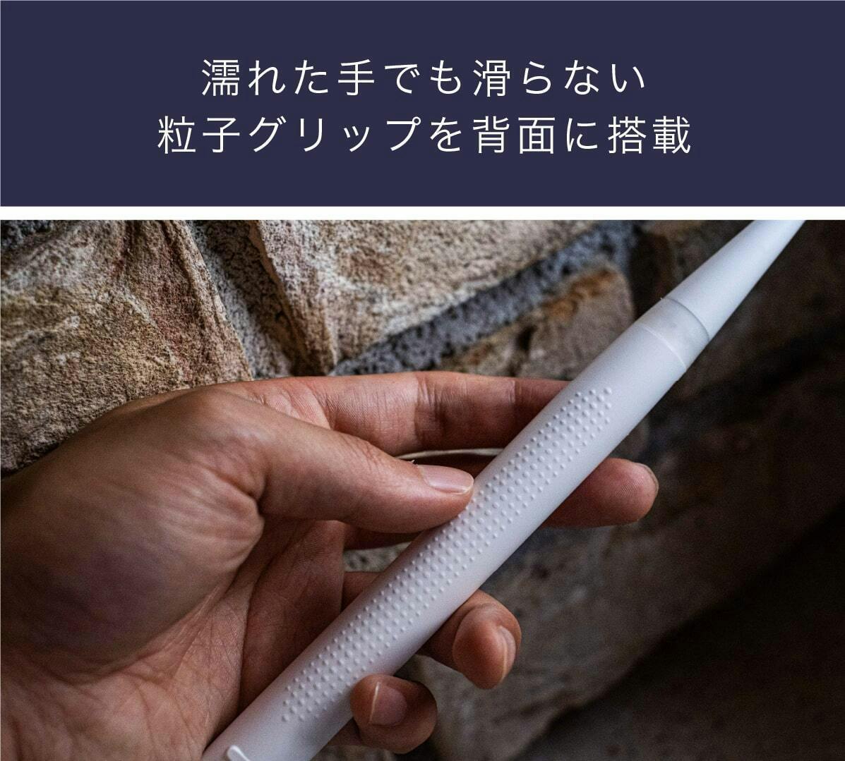 ミニマルソニックは軽くて小さいながらもパワフルです。その特徴を支えるのが粒子グリップです。手にしっかりフィットして高いグリップ力で磨くことができるのです。