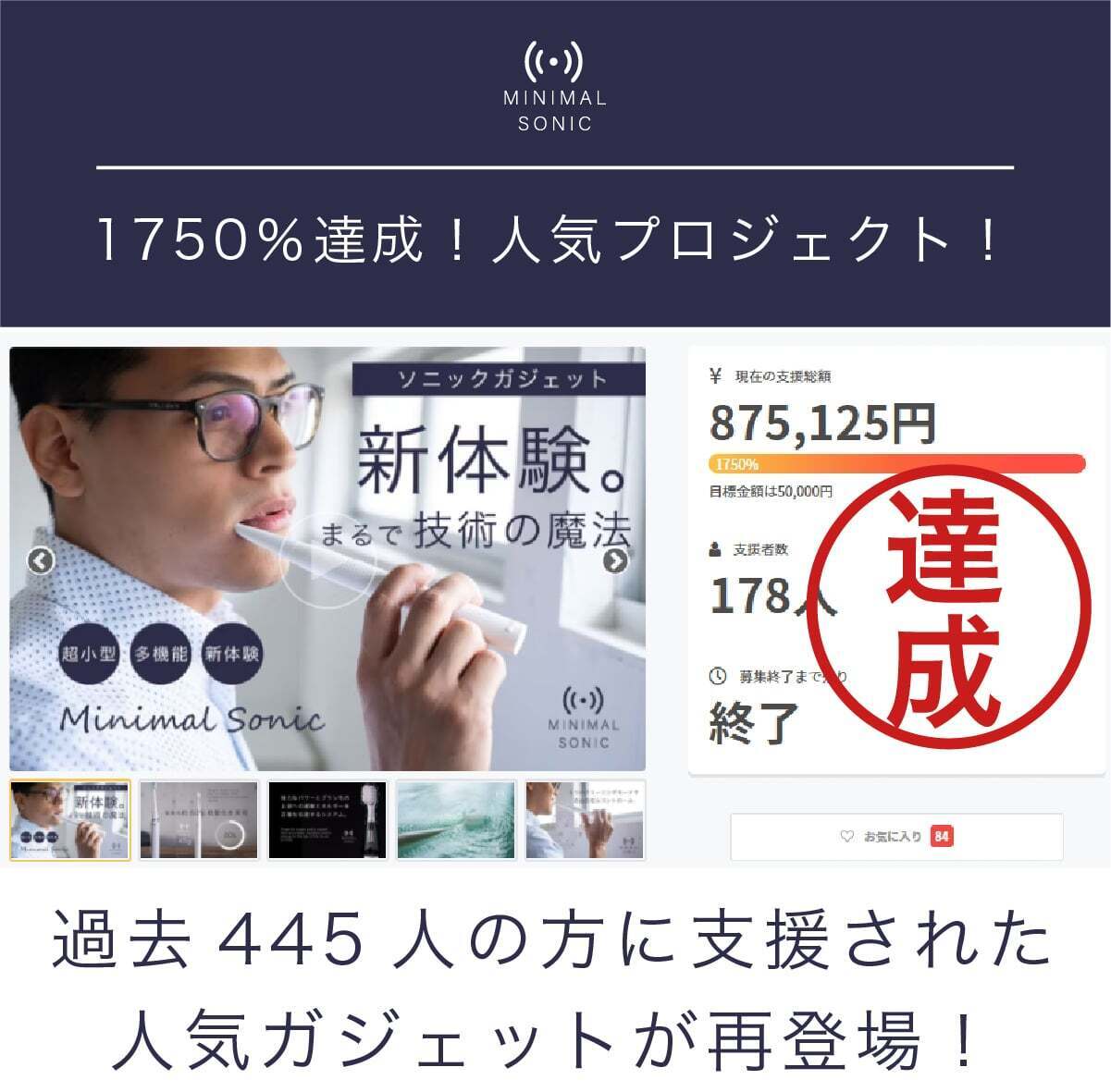 私達は日本の電動歯ブラシ普及率22%をなんとかしたいと考え、ミニマルソニックを誕生させました。口腔内のケアは大変重要なものであるにも関わらず、そのツールの進歩はまだまだです。ミニマルソニックが少しでも日本の電動歯ブラシ普及のきっかけになれば大変嬉しいです。