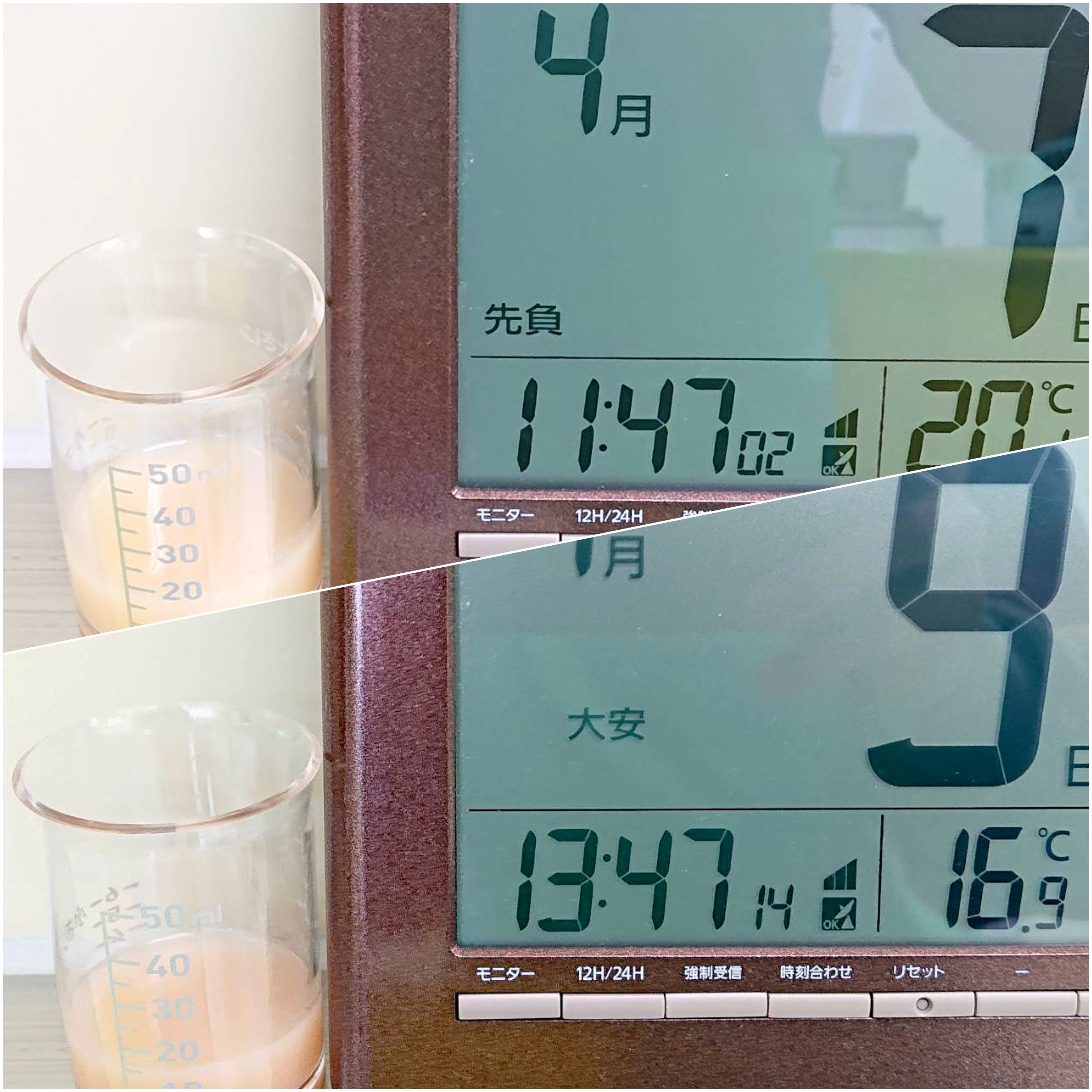 上の画像は50時間常温放置した時の画像です。御覧のように全く変色していません。その後50時間放置、計100時間放置しましたが変色しませんでした。変色しないということは味も変わらない、ということです。クエン酸やビタミンCなどの添加物を使わず、しかも100時間常温放置しても変色しない桃ピューレというのは、弊社が調べる限りございません!