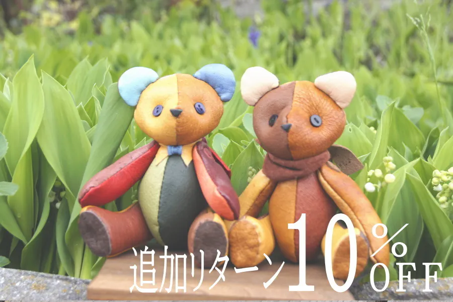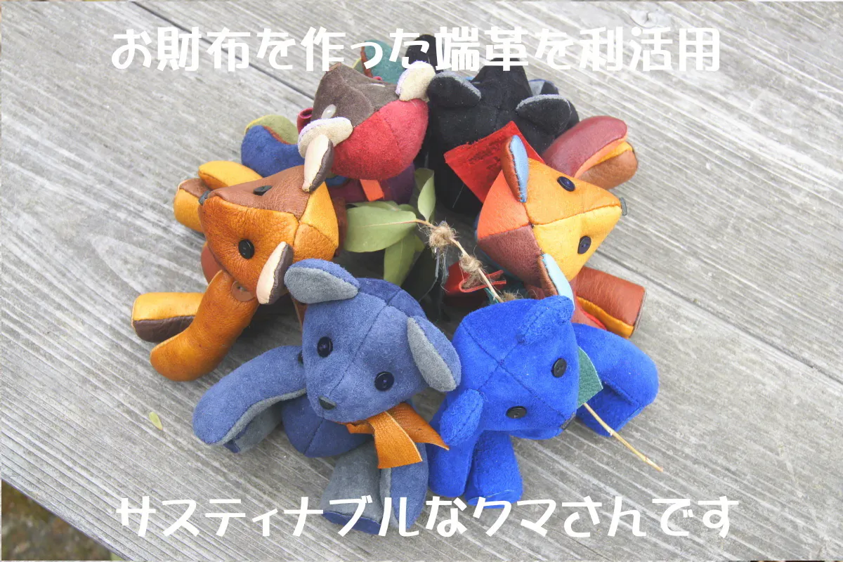 あなただけのクマのぬいぐるみ左はカラフル系、右は暖色系(茶色や赤系の革を使用します)