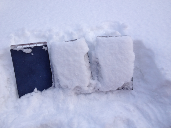 ↑この写真は上記の写真のサンプルを日中数時間放置したものです。撥雪コートしたスレート材は元々雪が付いていませんが、超滑雪コートしたスレート材上では気温が上がると雪が融け始め、滑り落ちます。またスレート材表面は濡れていません。