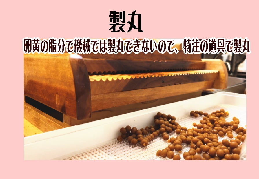 生ニンニクと生卵黄だけを使う事にこだわっているために(粉末ニンニクと粉末卵黄は使わない!)、卵黄の脂分で機械では丸まらず、昔ながらの作り方でしか作る事が出来ませんでした。