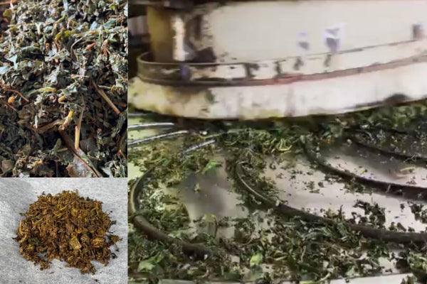 発酵した茶葉を乾燥させる様子、乾燥後の茶葉