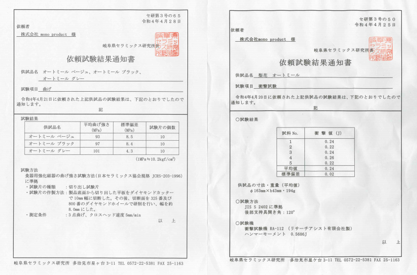 衝撃や曲げの試験も下記の通りとなります。丈夫で長い間、安心してご利用いただけると思います。