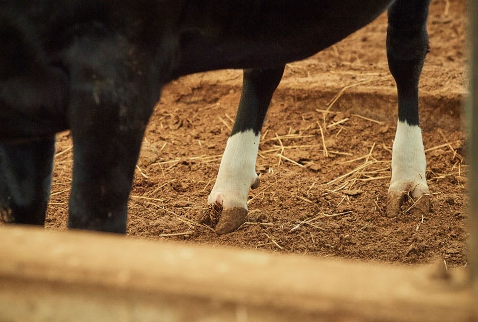 現在、佐賀・白石町で250頭あまりが飼育中です。交雑種と分類される牛ですが、これからの食文化に合った牛だと思います。 「しろいし牛」はパッと見、和牛のような黒色ですが、よく見るとどこかに母牛のホルスタイン種の白色の名残が。この牛は靴下をはいているようで可愛い。