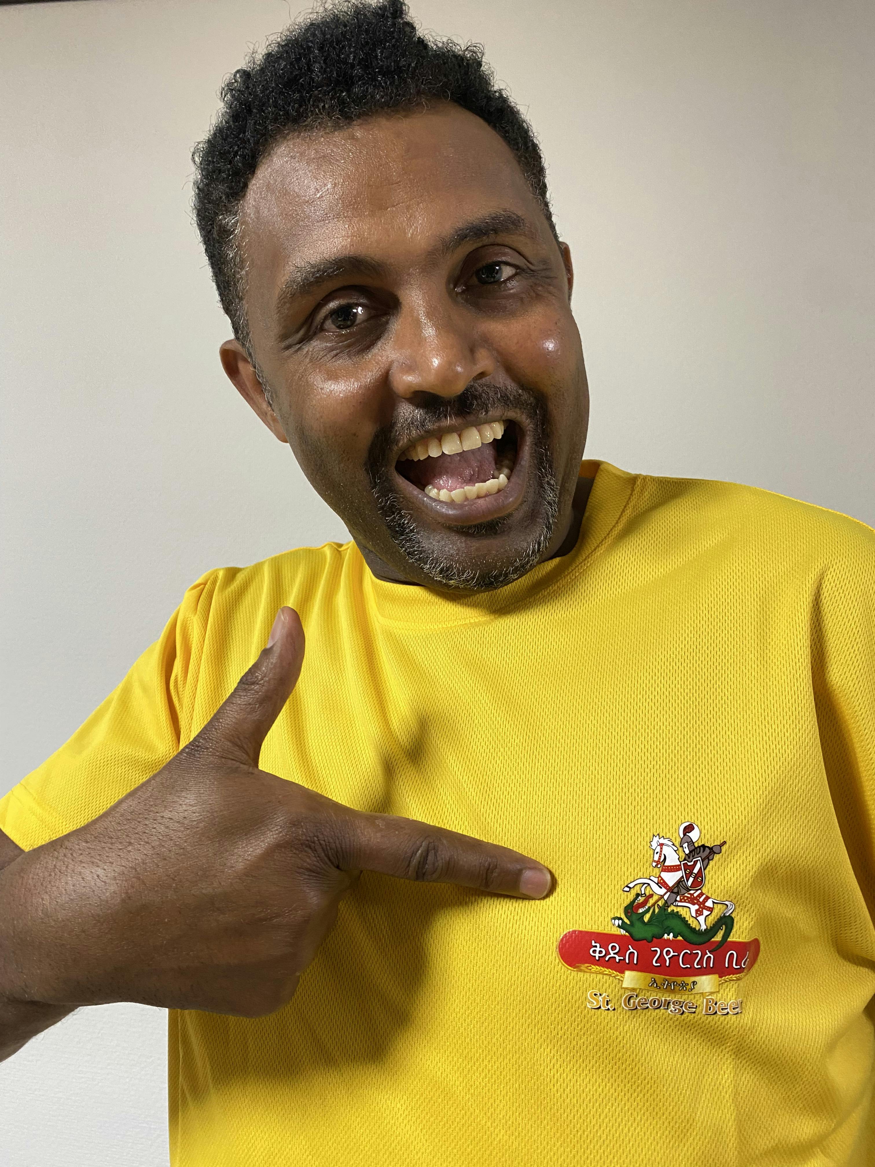 『セント・ジョージ』の生産企業BGIと打ち合わせをしにエチオピアに行っていたダニエルが帰国しました!打ち合わせはスムーズに進んだようで、輸入実現にむけまた一歩前進です!写真はBGIからもらったセント・ジョージTシャツを着るノリノリのダニエル。