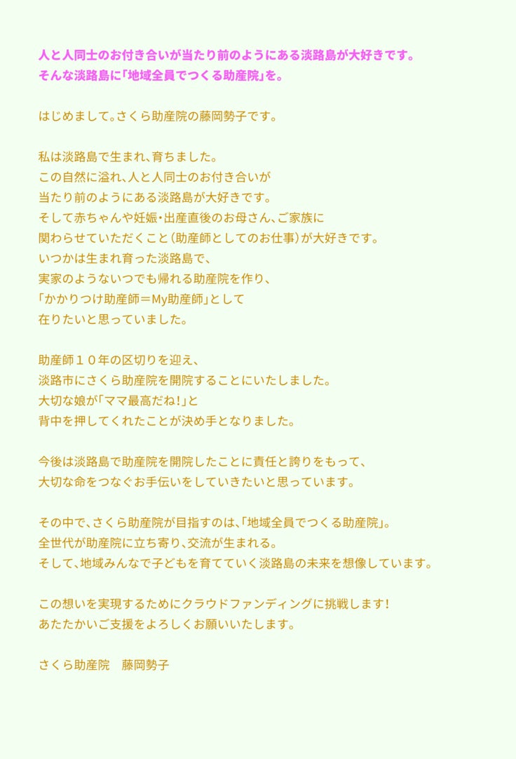 今現在日本では子育て支援の拡充が徐々に図られている状況ですが、その子供を出産できる場所が淡路島にはあまりにも少ない、この現状に違和感を抱かずにいられるでしょうか。そうした面で、今この時代この瞬間に、ここ淡路島で、助産院を立ち上げる必要性を感じて頂けると思います。
