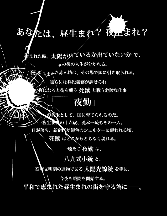 『夜勤』はハードボイルドなバトルアクション小説なのですが、夜に産まれた者だけが死獣と戦わされるという、これまでにない斬新な設定で、Web発表時や同人誌での発表時には多くの反響をいただきました。