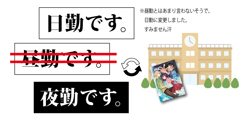※「昼勤」とはあまり言わないとご指摘があったので「日勤」となりました。すみません;