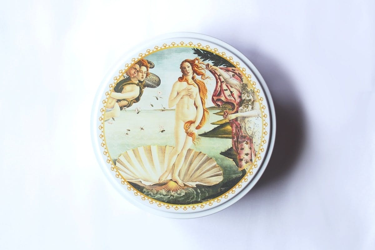 「『ヴィーナスの誕生』の世界観を詰め込んだお菓子缶」