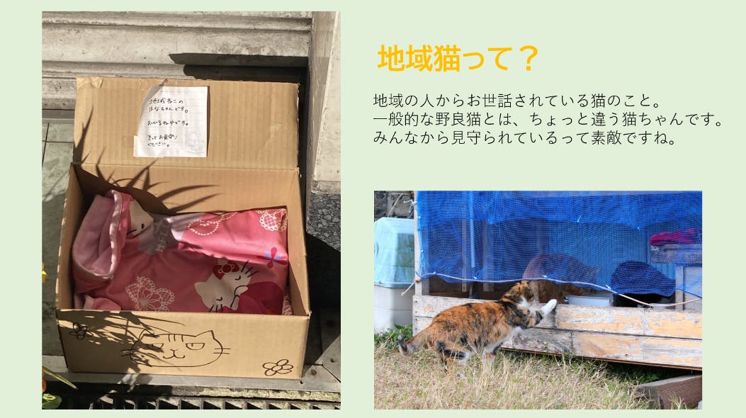 屋外に生息し,周辺住民の合意を得た上で,地域住民が主体となって不妊去勢手術を施され,トイレや給餌など一定のルールに従い管理される猫のことです。(福岡市「ねことの共生ガイドライン」より引用させていただきました。)