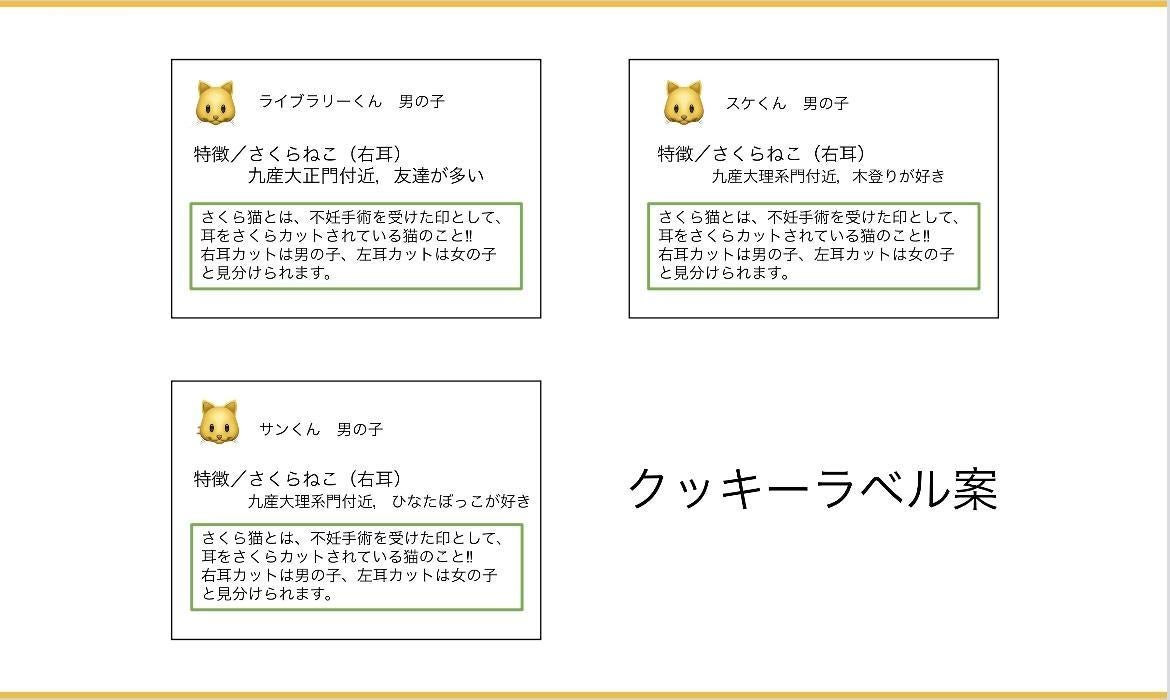 また、クッキーには、九州産業大学付近の猫情報が載ったラベルを貼り、自分達の身近にはどのような猫がいるのか知ってもらいたいと考えています。