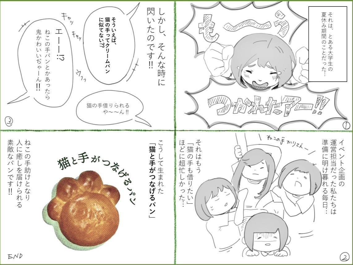 この「猫と手が繋げるパン」は、"猫の手も借りたい"ということわざがきっかけで作られることになりました。