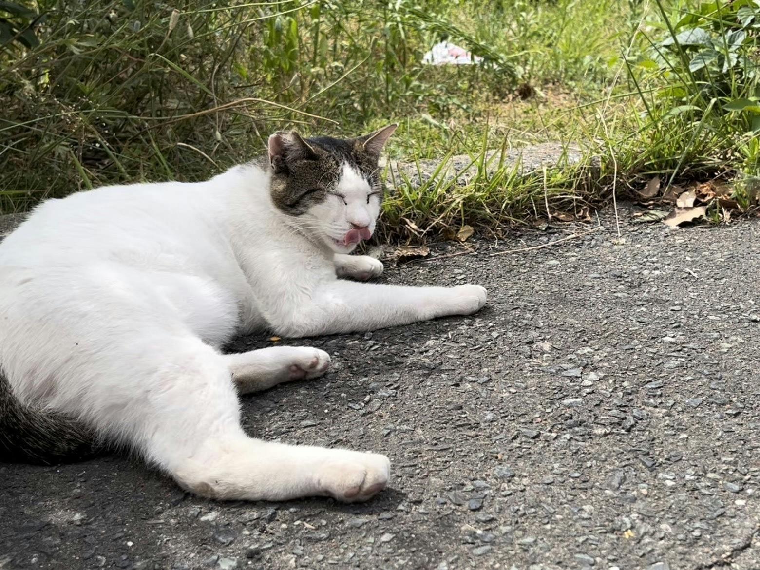 上の画像の猫は、大学周辺にたくさんいる猫の中で、ナンバー1と言って良いほど毎日のように見かける猫です。木陰にいたりそのすぐ近くにある公衆電話の横にいたり、夜になると大学構内で遊んでいたりするのをよく見かけます。