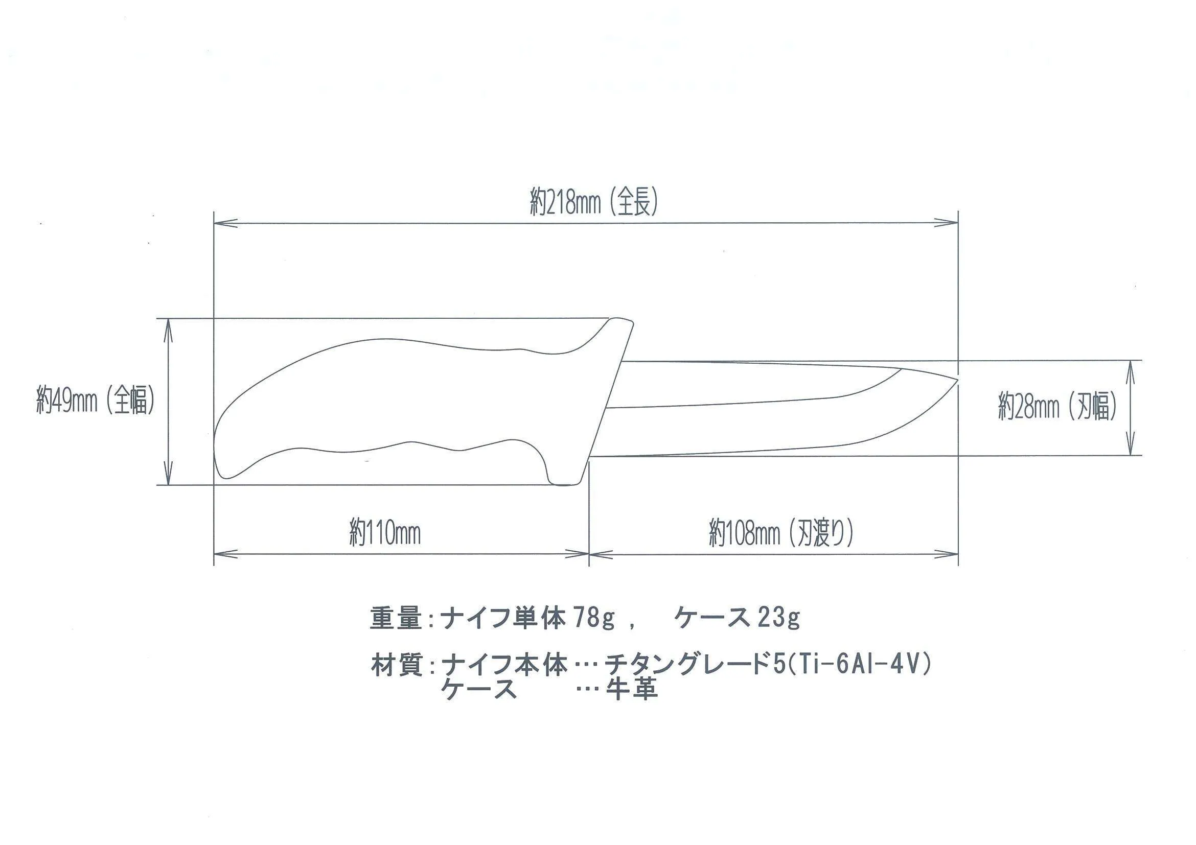 チタン素材は海水や水に対して耐食性(サビにくい)に優れている、人の体に優しく安全性(金属アレルギーがおこりにくい)も高い特徴を活かしてキャンプでの調理や家でのおもてなしにちょっと贅沢な時間を提供できるチタン製ナイフです。チタンはステンレス素材と比較して約半分の重さの為、とても軽い金属です。(製品重量78g)