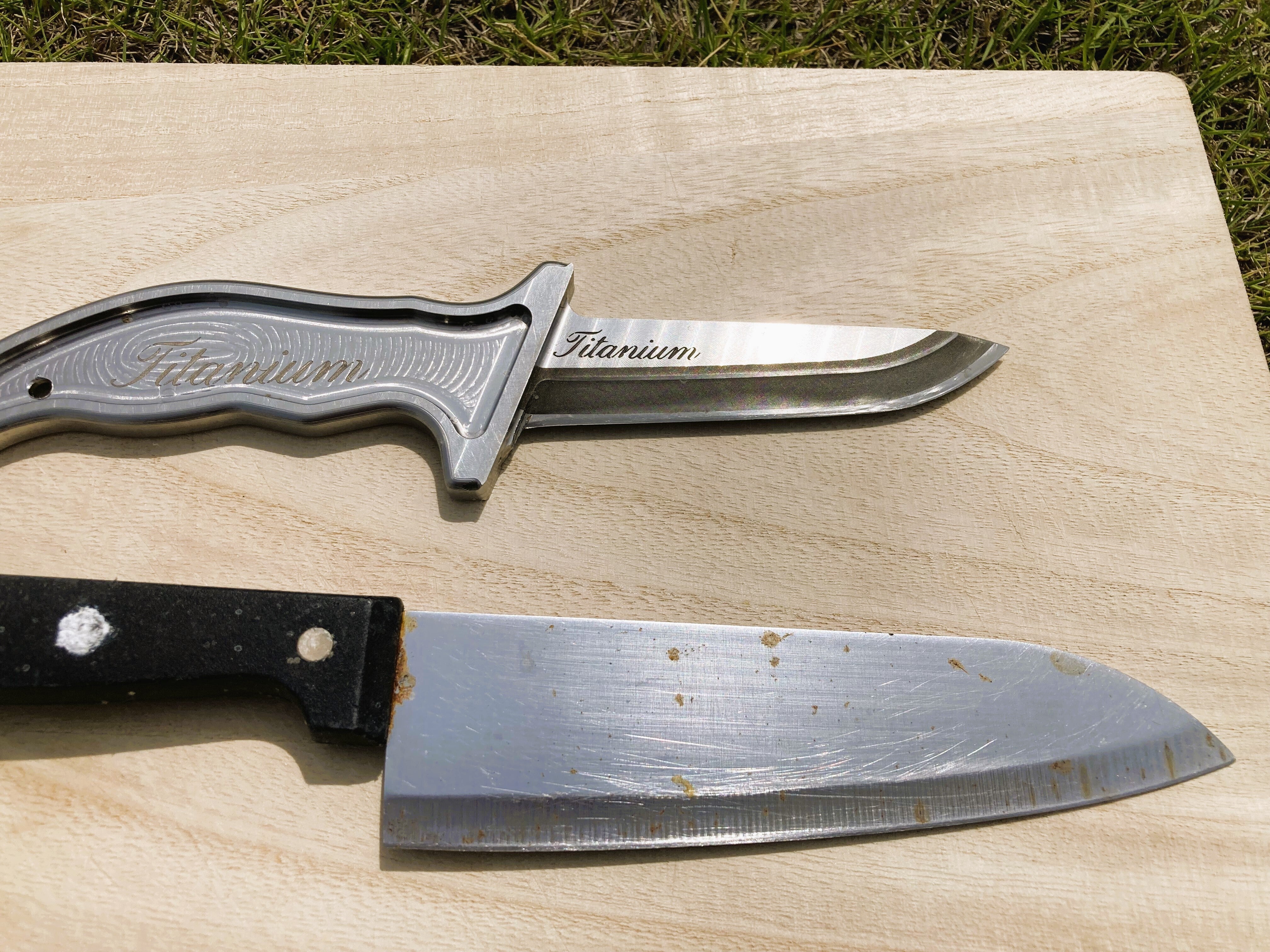 2022/06/20 15:09今回は検証を続けてきた腐食(錆び)を確認していきたいと思います。↑海水へ10日間沈めた状態での錆びの状況 ステンレスも錆びにくい材質ではありますが、多少の錆が発生しています。チタンナイフは全く錆が発生していませんでした。↑海水へ25日間沈めた状態での錆び状況 ステンレスは10日目と比べて錆の範囲が広がってきています。 チタンナイフは錆の発生は確認できませんでした。(刃部は梨地加工のトライを行ったため少し茶色いですが錆ではありません。) 刃の切れ味も落ちていませんでした。切れ味抜群!私たちも今回の検証によりチタンが海水にとても強い(錆びない)ことがわかりました。 もっと見るキャンプで使ってみました!肉も切れ味抜群!