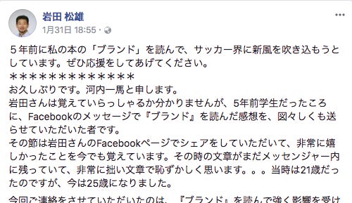 読み終わった自分は何を思ったかFacebookで岩田さんを見つけ、無謀にも本を読んだ感想を送ってしまったのですが(若気の至りです…)、その際も快くご返事をいただき、私のことを応援してくださいました。