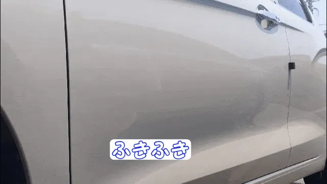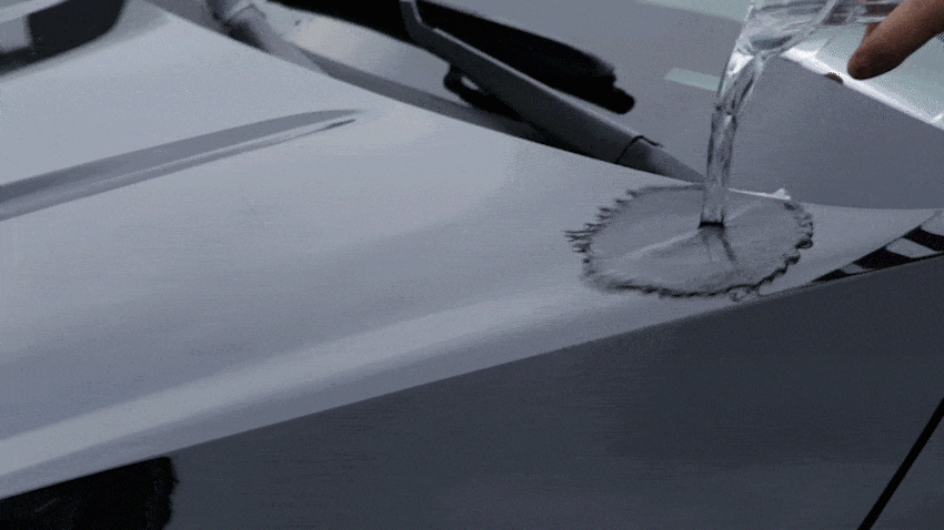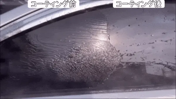 エアガンを利用して撮影したもので、風を吹きつけた部分の水滴が急速に飛び散る様子を確認できます。コーティング後、時速45キロ以上の走行時、自然に水が弾け散ります。コーティング時は水分が留まりにくくなり、素早く弾き飛ばせるコーティング膜が作られます。