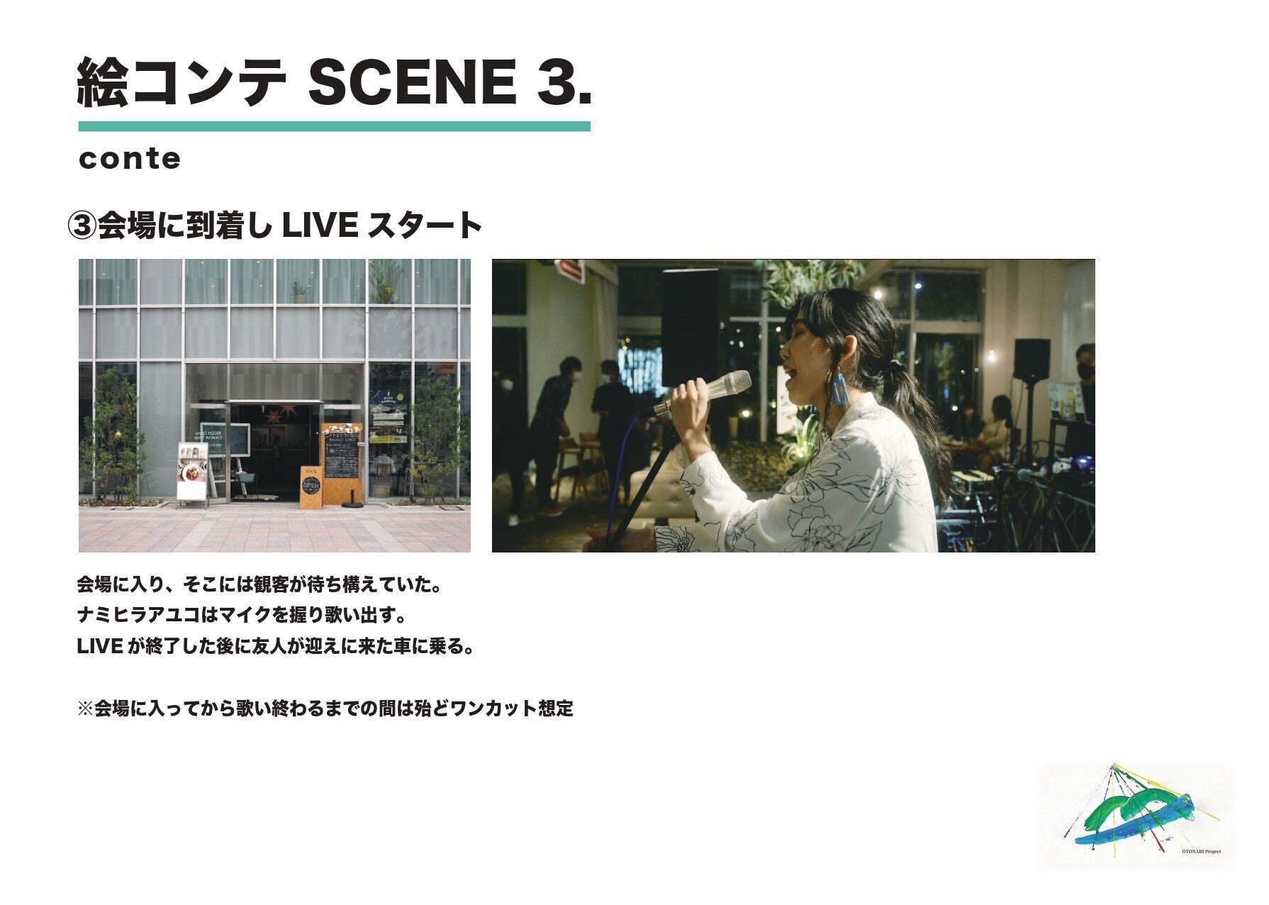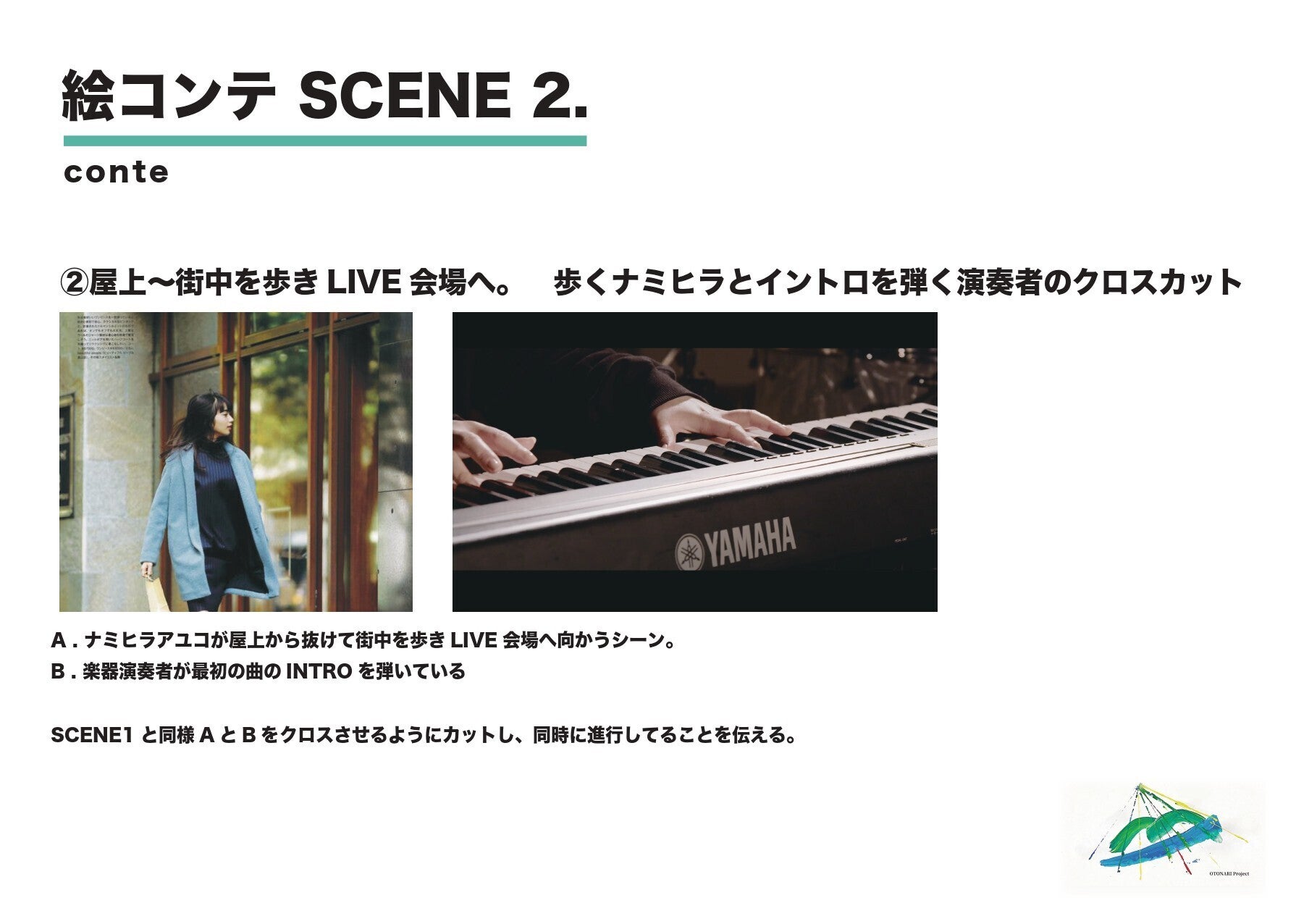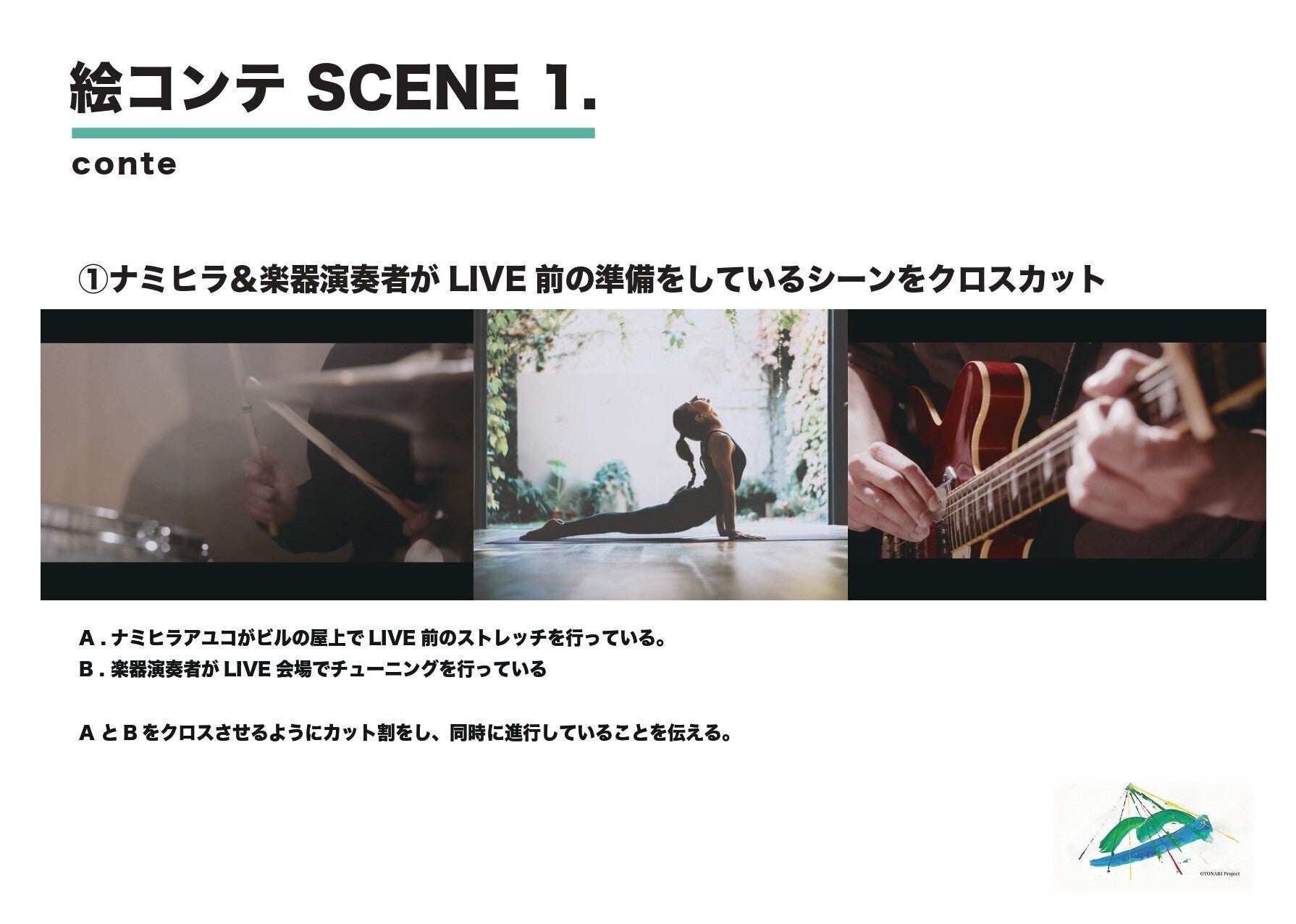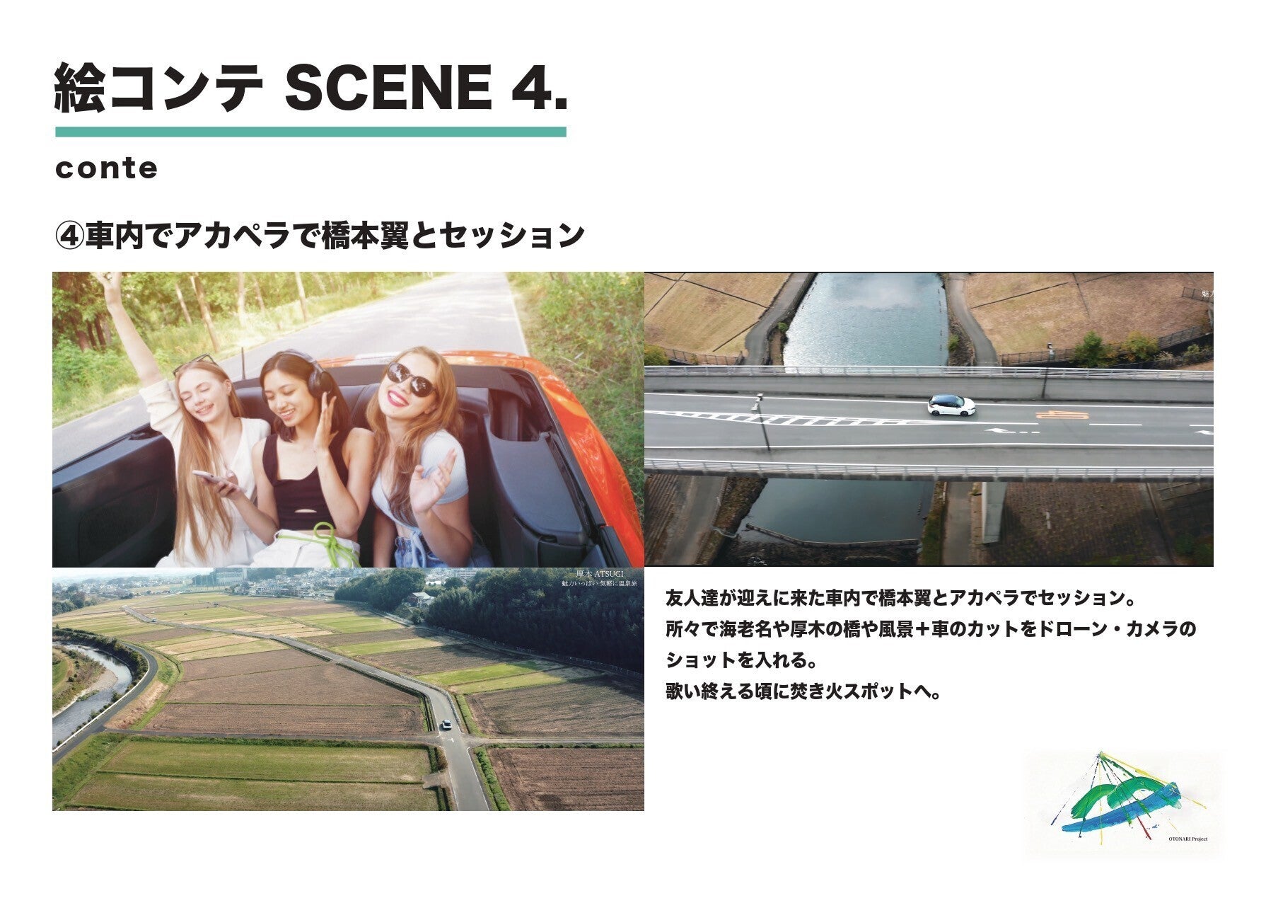 映像作品の企画、制作は、動画クリエーターのYOTA NARUSE(神奈川県厚木市出身)で、次のような絵コンテの下、制作を進めたいと思います。