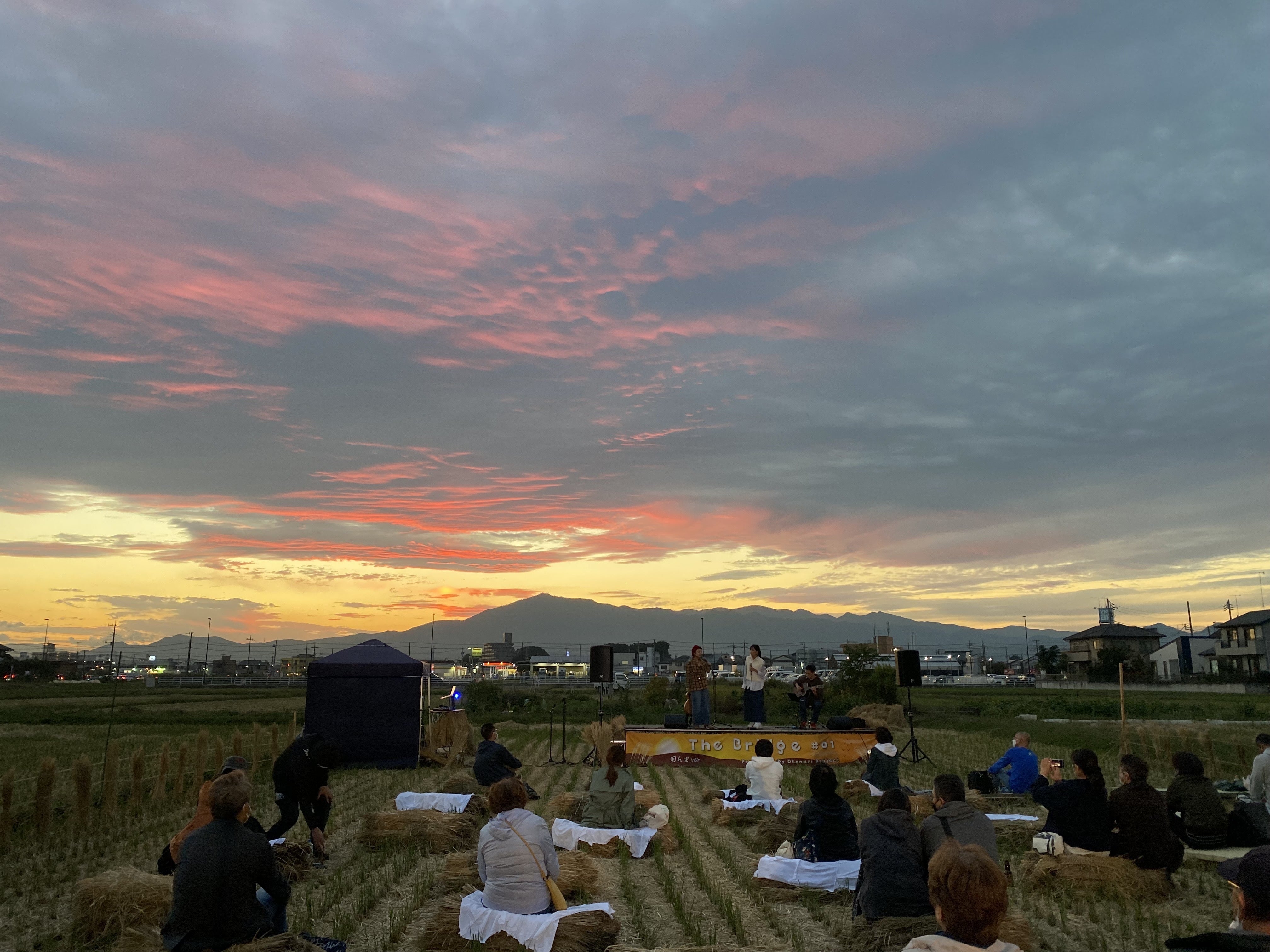 2022/10/23 18:29クラウドファンディングをご支援いただきました皆さま、ご無沙汰しております。おかげさまで昨日、OTONARI Projectの2回目のイベントとなる「The Bridge #0.1 田んぼver」を開催することができました。秋になり夕暮れ時に味わいが出てきた季節となりましたが、それをより一層感じられるような場所を会場といたしました。稲刈り後の田んぼを会場に、音楽を楽しめる空間をつくり、現地には70名ほどの方がお越しになり、Live配信では約30名ほどの視聴があり、合計で約100名の方に今回のイベントを見ていただくことができました。理想では200名に見ていただくようにしたかったのですが、力不足でそれに及ばなかったことは今後の糧にさせていただきたいと考えております。一方で、このプロジェクトの基本的な考えの1つに、神奈川県央のカルチャーを盛り上げるため、県央特有の自然を生かすことがありますが、まさにそれを実現したようなイベントになったこともあわせて報告させていただきます。ぜひ写真とあわせてOTONARI ProjectのInstagramアカウントもご覧いただければ幸いです。田んぼが広がる中、視界を遮るものは少なく、丹沢山地、大山を雄大に臨みながら、夕陽が包むまれながら音楽に浸る感覚は屋外フェスで得られる経験のそれそのものでした。このような地域を生かした表現の場づくりの価値を、ご来場者には感じていただき、メンバー自身も再認識が図れました。あらためて、応援いただいております皆さまに心よりお礼申し上げます。今後とも、何とぞよろしくお願いいたします。 もっと見る
