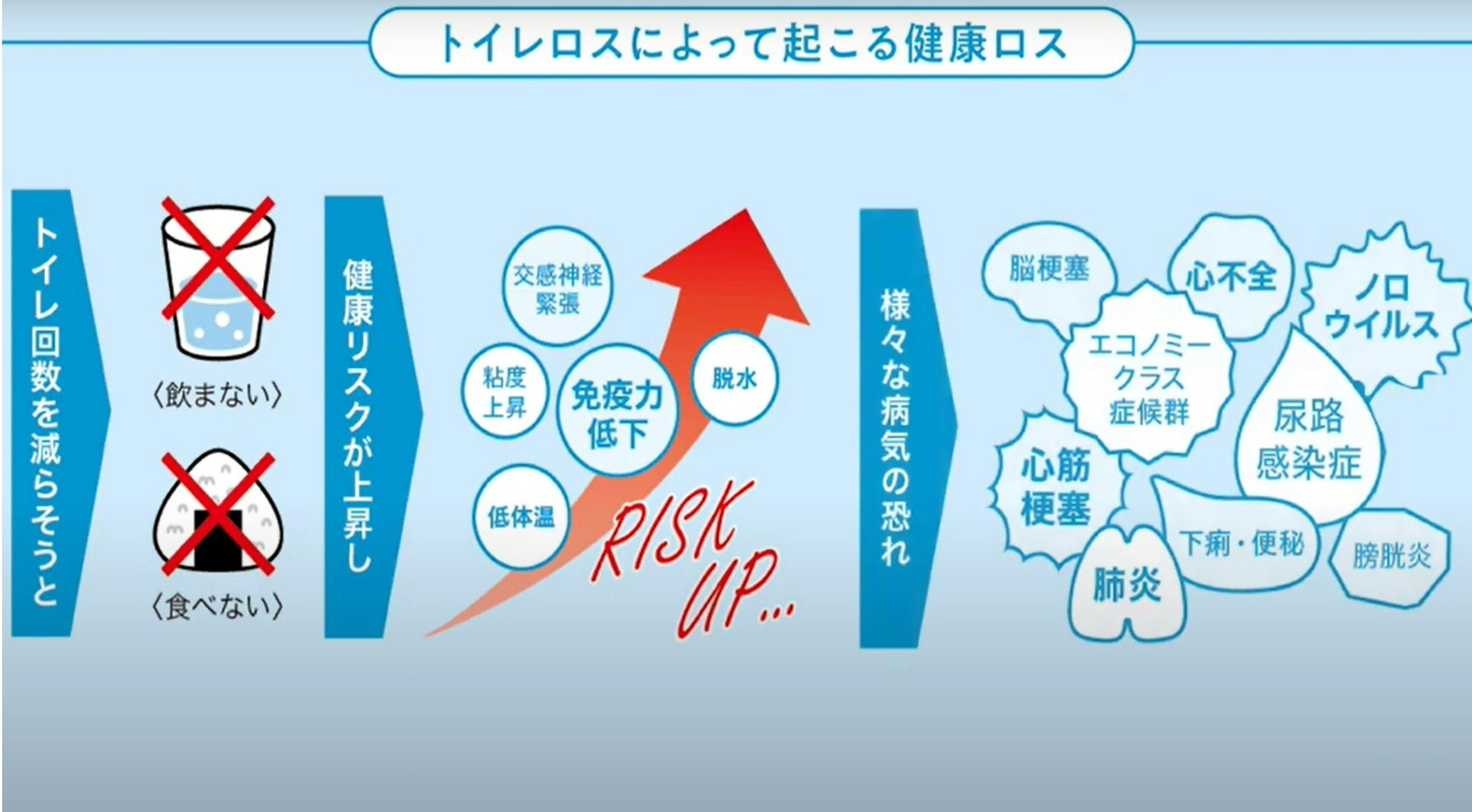 また、避難所等において、トイレが不衛生であるために不快な思いをする被災者が増え、その上、トイレの使用がためらわれることによって、排泄を我慢することが水分や食品摂取を控えることにつながり、被災者においては栄養状態の悪化や脱水症状、静脈血栓塞栓症(エコノミークラス症候群)等の健康障害を引き起こす恐れが生じます。