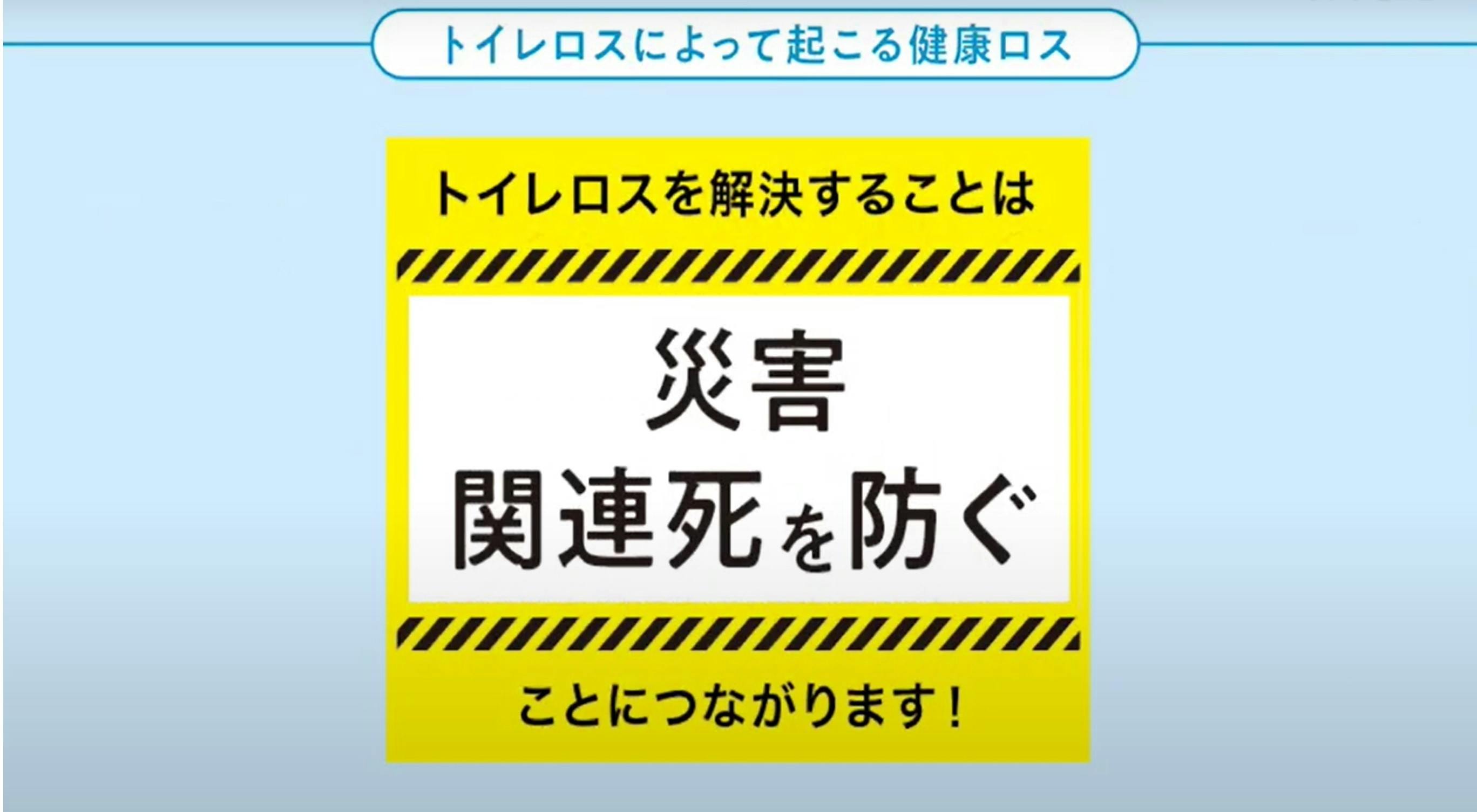 私はあるとき知人から「災害関連死」の話を聞き、その要因の1つが災害時のトイレ環境不足という事実を知りました。