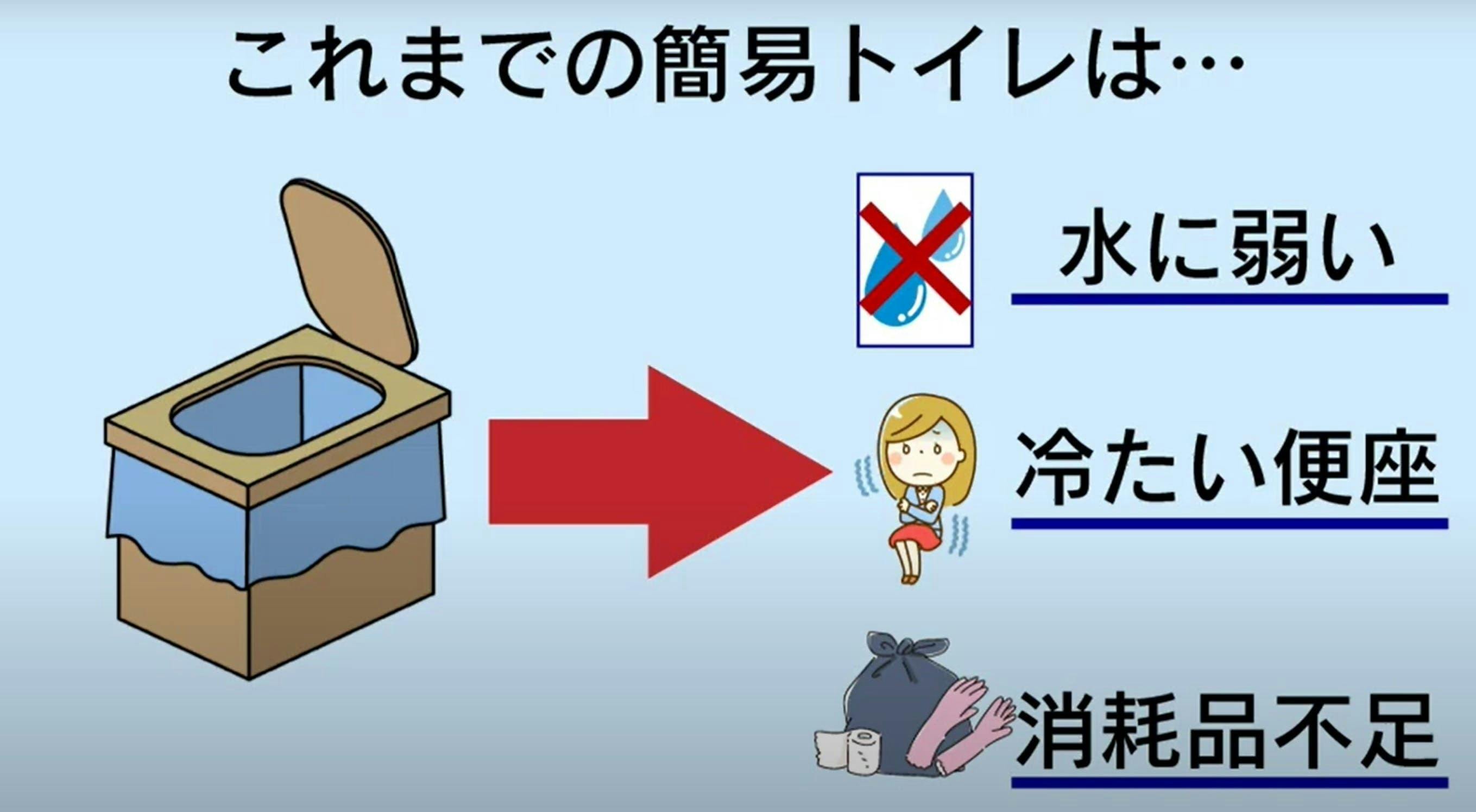これまでの大災害でライフラインが停止したとき、一番に直面する問題が『トイレ』でした。水洗トイレが使えなくなると、衛生環境は一気に悪化し、人としての尊厳を守ることも難しくなります。