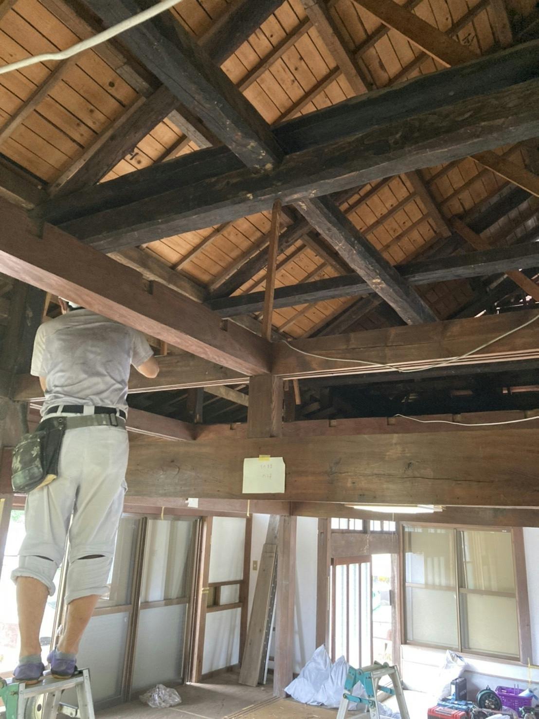 清川村の棟梁・山口さん(山口製材さん)を中心に、大工さんが不要な部分の解体作業を行っています。天井を外したら、こんな感じで屋根の構造が剥き出しになりました。