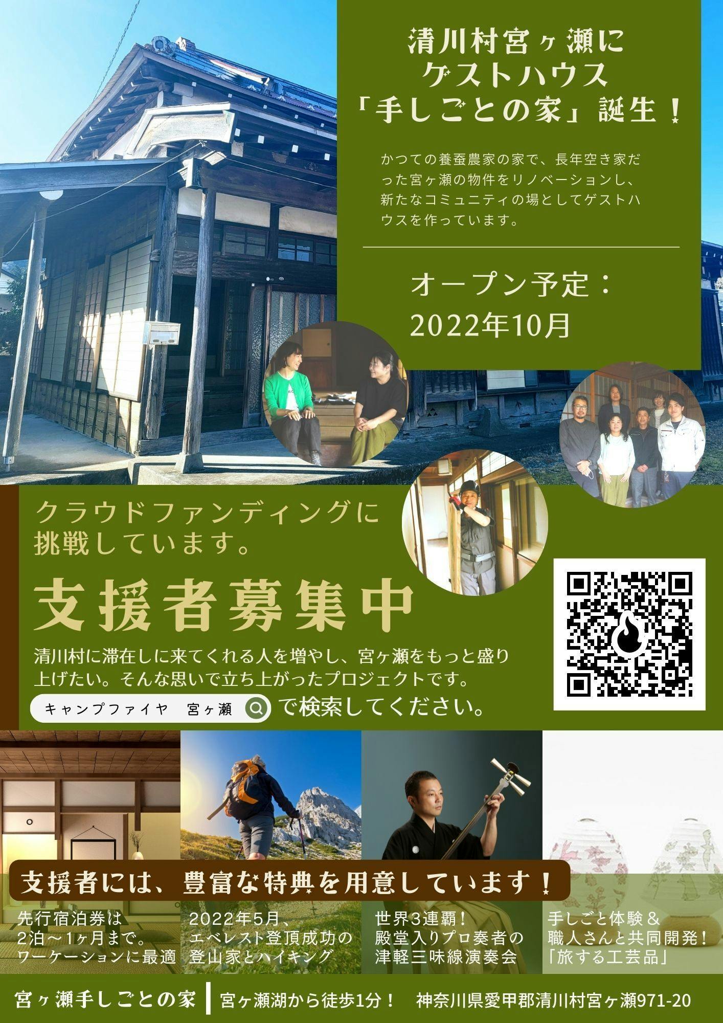 清川村の皆さんや清川村に観光やアクティビティで来られる人に、「宮ヶ瀬手しごとの家」のプロジェクトを告知するために、クラウドファンディングの支援者募集チラシを村内店舗に設置しています。