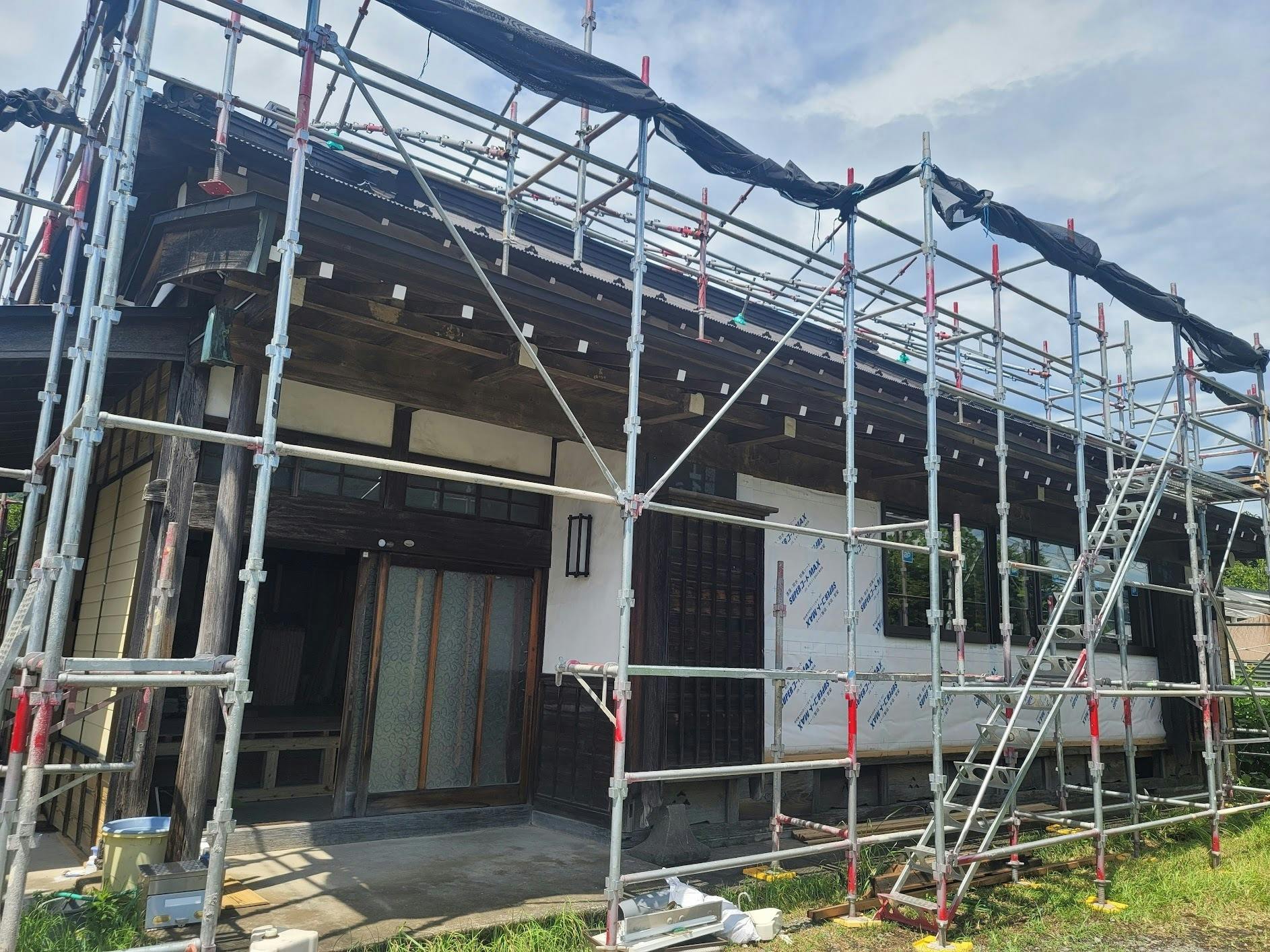 朝のボランティア活動の後、工事の進捗を確認しに物件へ行ってみました。下の写真からもお分かりのように、外観は足場で囲われています。