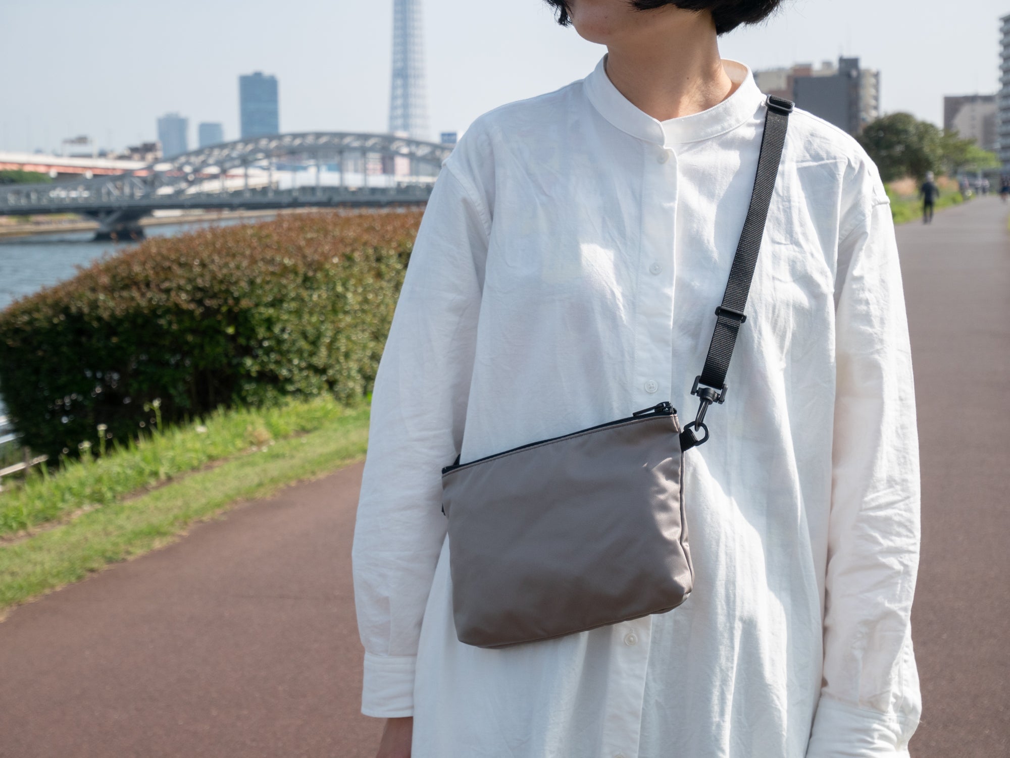上品な光沢のあるグレー色ナイロン生地で、荷物が少ない近所のお買い物やお散歩など、オフの日にピッタリ!