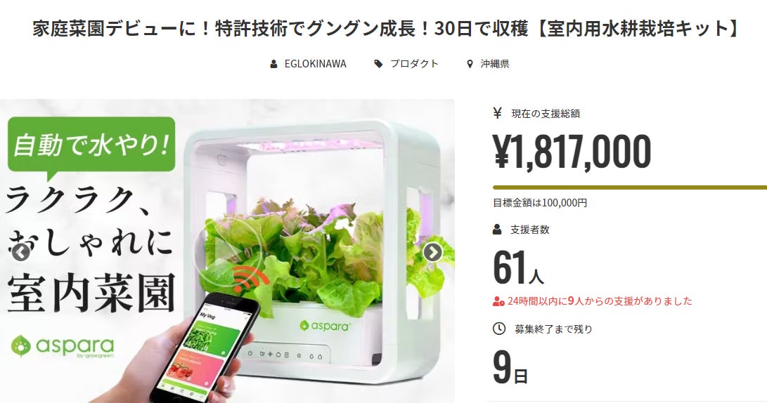 皆様こんにちは!アスパラガーデンお得な先行予約販売は本日23:59終了となります。多くの方のご支援、心より感謝申し上げます。この後は一般販売へ向けて準備を進めて参ります。一般販売では定価での販売となりますので、お得な価格で買えるのは本日までとなっております。もしお悩みの方がいらっしゃいましたら、ぜひお得にいち早く手に入るこの機会をお見逃しなく!弊社オフィスでアスパラガーデンでミニトマト栽培中です。定期的に水が循環するのですが(自動水やり機能)水が流れる音は仕事の癒しになっております。そして植物の成長を日々楽しんでおります。皆様に末長くアスパラガーデンを楽しんで頂けるよう、種子キットの種類を充実させたり、種子キットと栽培キットのお得なサブスクモデルを構築したりといろいろアイデアを練っているところです。今後も活動レポートで情報を共有して参りますので、どうぞご期待ください!!それでは残り数時間となって参りましたが、最後まで何卒よろしくお願い申し上げます。ご質問はお気軽にメッセージくださいませ。アスパラガーデン日本正規代理店株式会社EGLOKINAWA 物販事業部一同