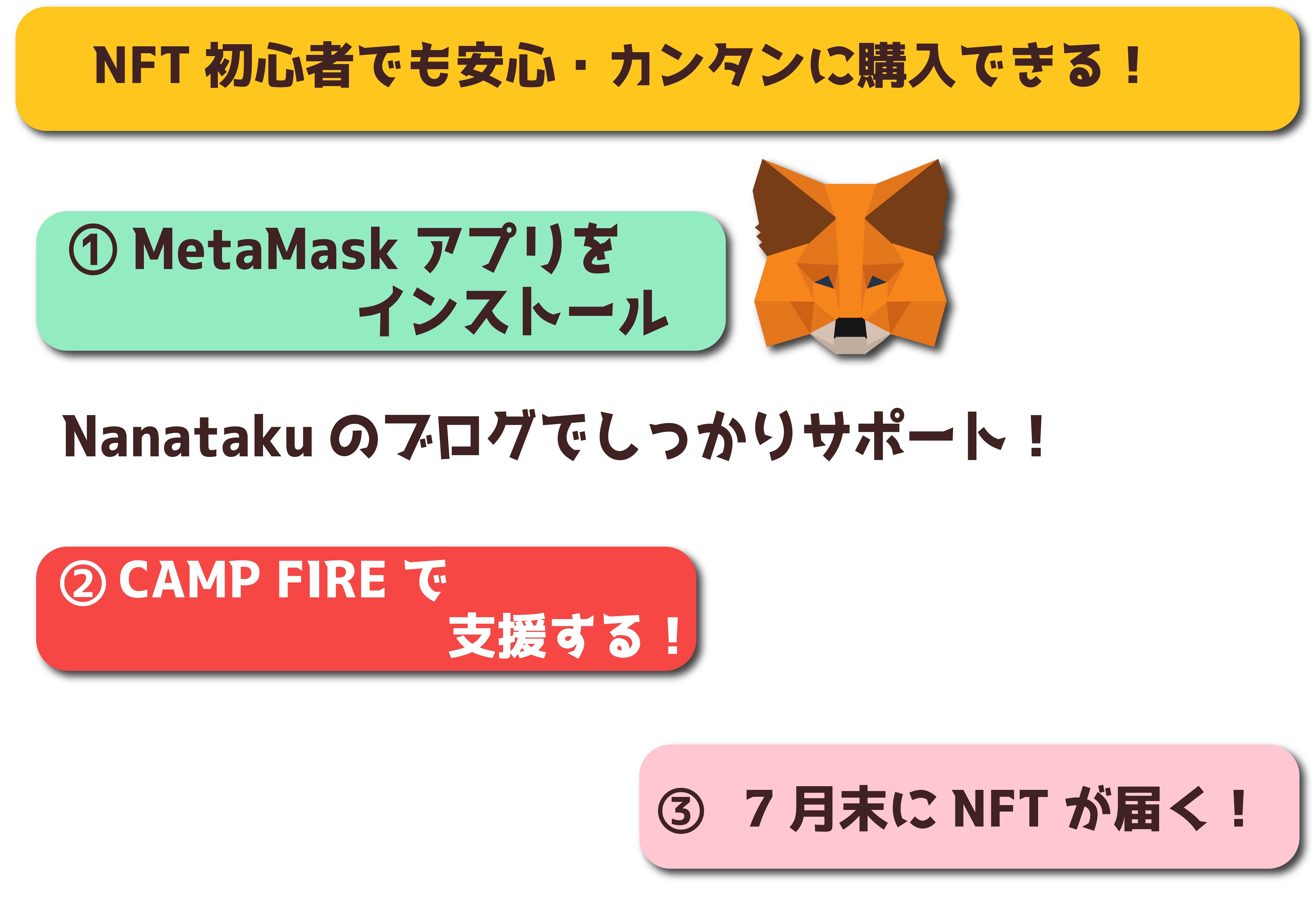 NFTを買ってみたいけどどうしていいかわからない!そんな方はまずMetaMaskという無料アプリをいれるところからはじめましょう!解説はこちら!https://nanataku.net/nft-metamask/上記の内容をTwitterスペースで音声案内しています。https://twitter.com/i/spaces/1rmxPgXLOMZJNインストール後は1.Metamaskのアドレスをコピーする!2.https://camp-fire.jp/projects/view/582635 リターンを選択してMetamaskのアドレスを備考欄に記入してください3.7月末にNFTが届くのを待つだけ!初めての方でも①仮想通貨を用意しなくても日本円でNFTが買える②ただ買うだけじゃなくてプロジェクトを応援できるこれがcampfireの新しい楽しみ方になるといいですね。話題のNFTを気軽に楽しめますように!