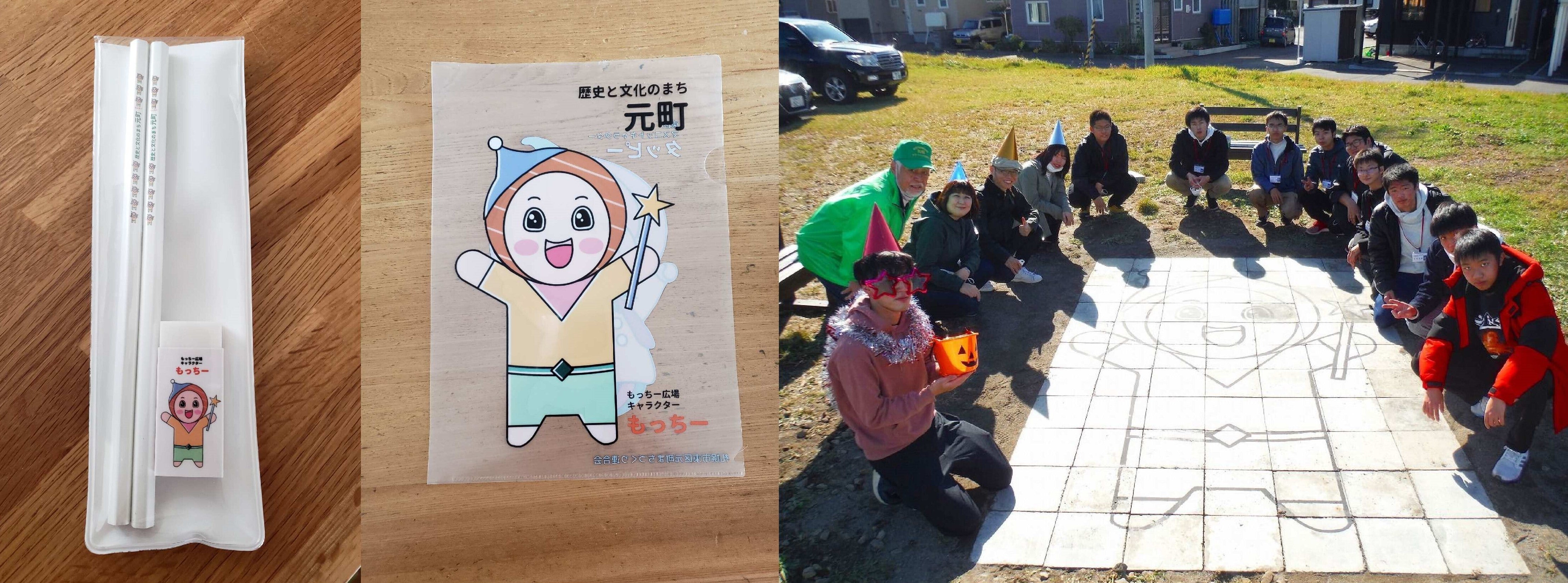 思いを込めて、学生さんたちが「もっちー広場(元町交流広場)」と名付け、地域の小学生からイメージキャラクターを募集し、たくさんの応募の中から「もっちー」が生まれました。