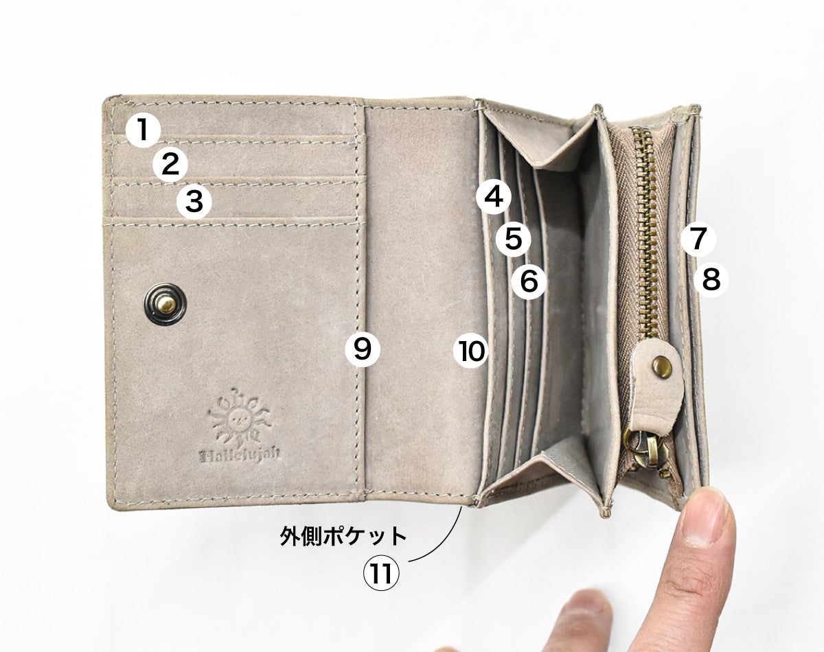 カード以外も収納できるサイズ違いのフリーポケットで、例えば常備薬や、メモ、お守りを入れておいたりと、あなたのライフスタイルに合わせた使い方ができます。