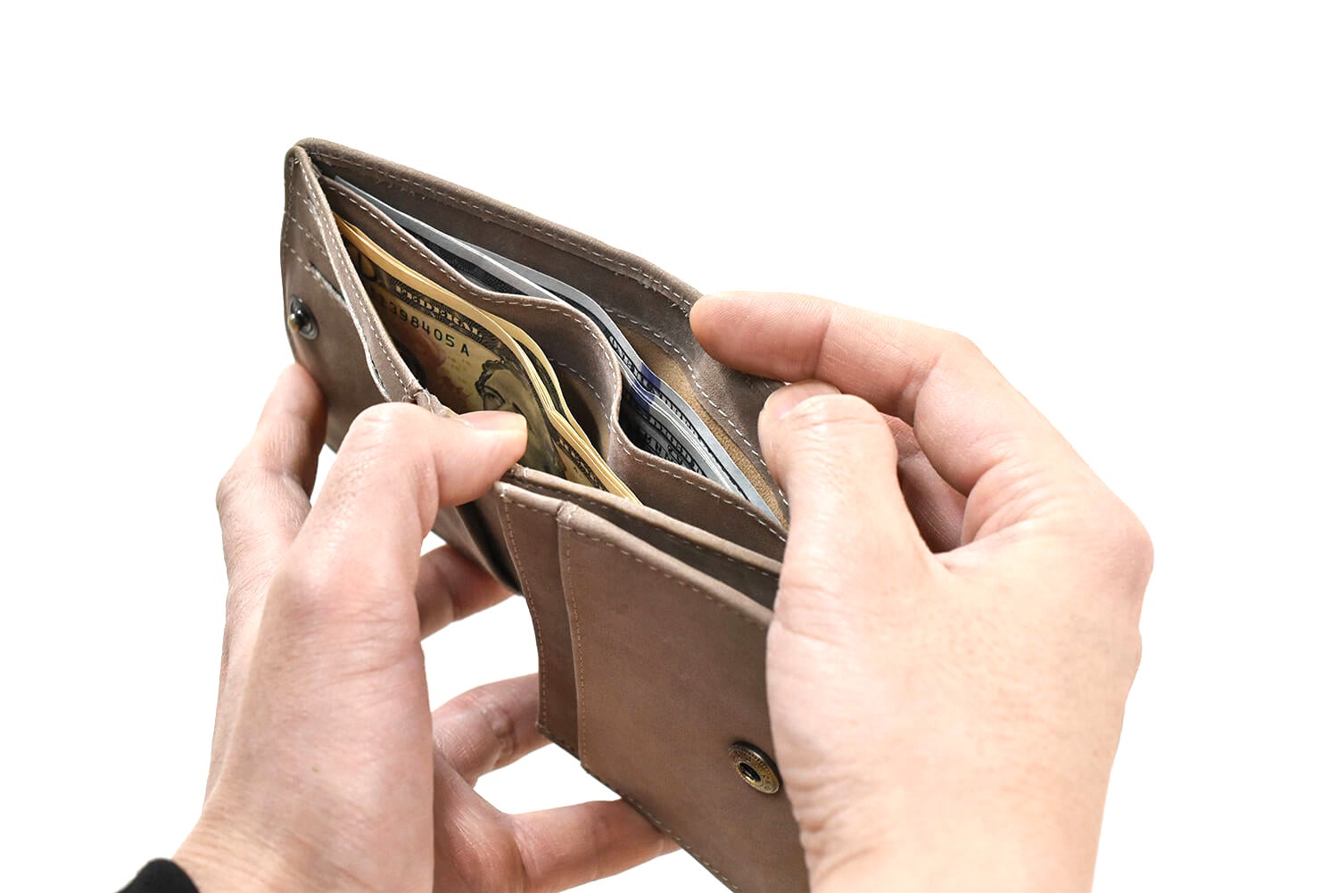 中央の仕切りで仕分け収納ができるので、一万円札は奥に、よく使う千円札は手前に。といった種類分けが可能です。