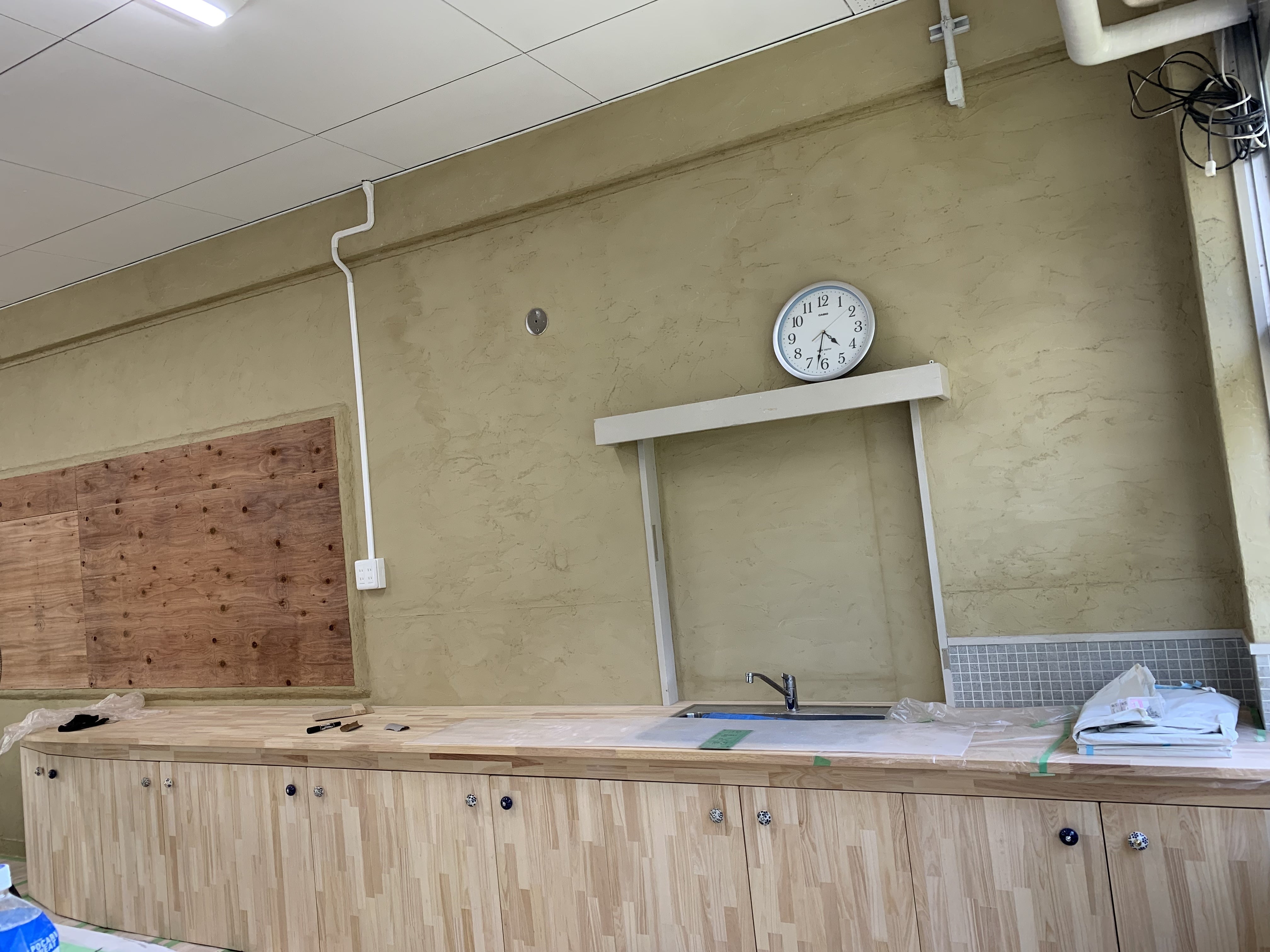 壁側には簡易キッチンが取り付けられ、木の香りのする大きなキッチンが完成していました!