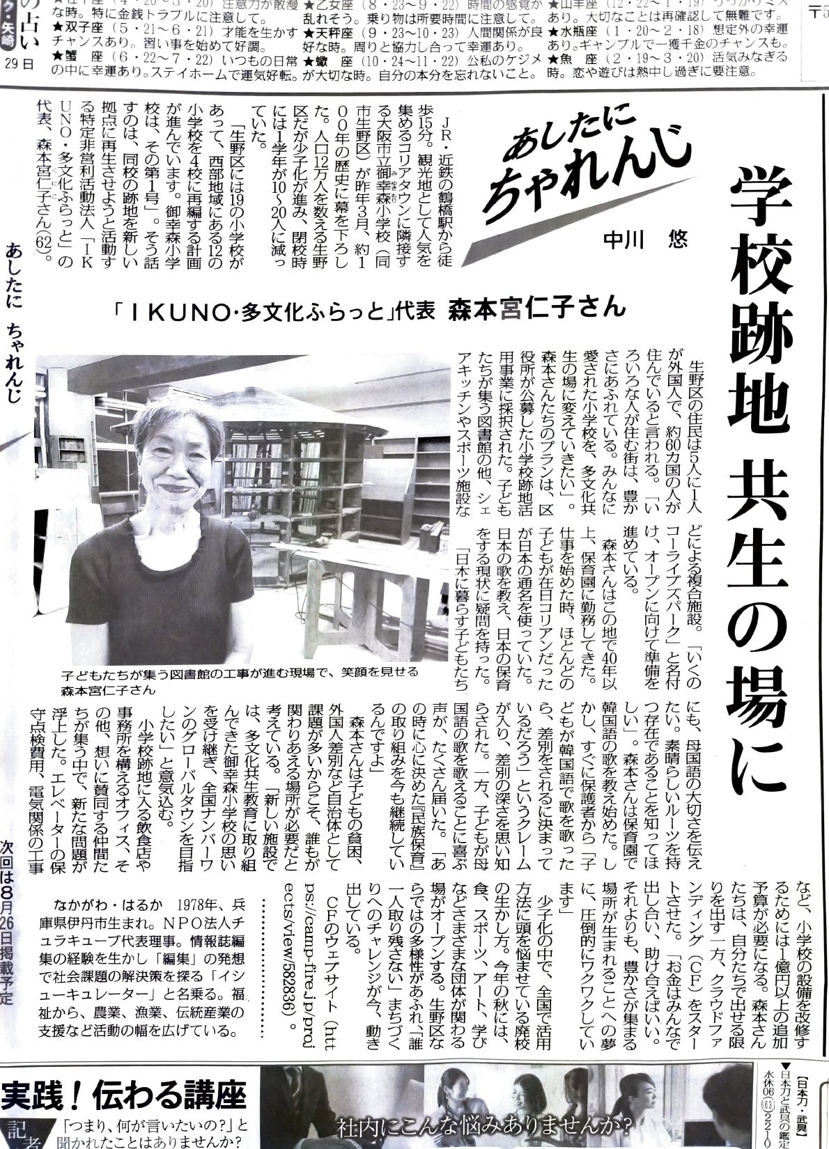 毎日新聞の“あしたにちゃれんじ”にて、「IKUNO・多文化ふらっと」代表森本宮仁子さまが掲載されました。