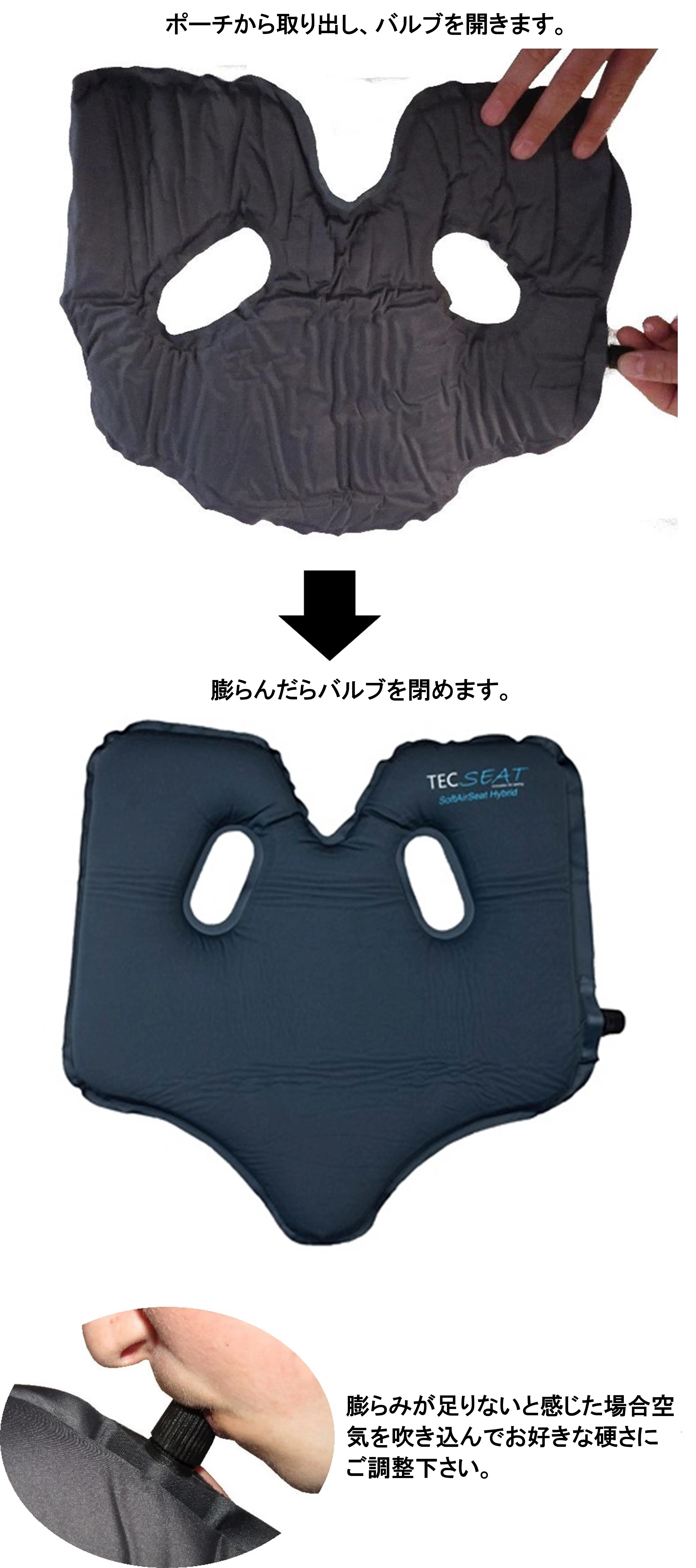 簡単に膨らむ自己膨張機能は自分にあった硬さに自由に空気量で調整可能です。