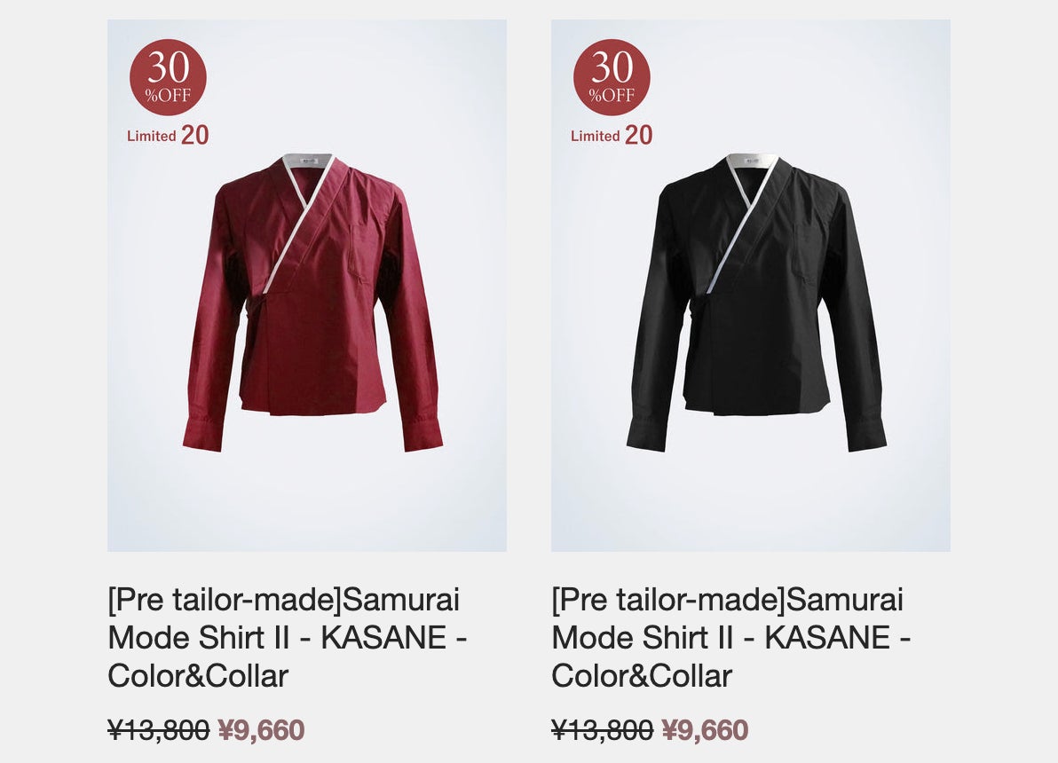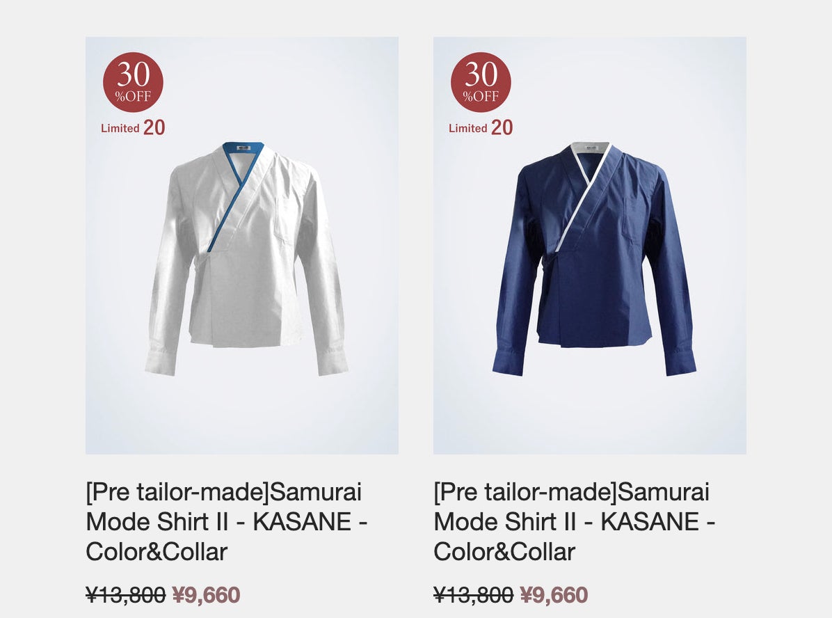 気軽にkimono Styleを楽しめて皆さまに大好評をいただいてる「Samurai Mode ShirtII KASANE」を数量限定ですが最大30%OFFで皆さまの為にお作りしてお届けします。