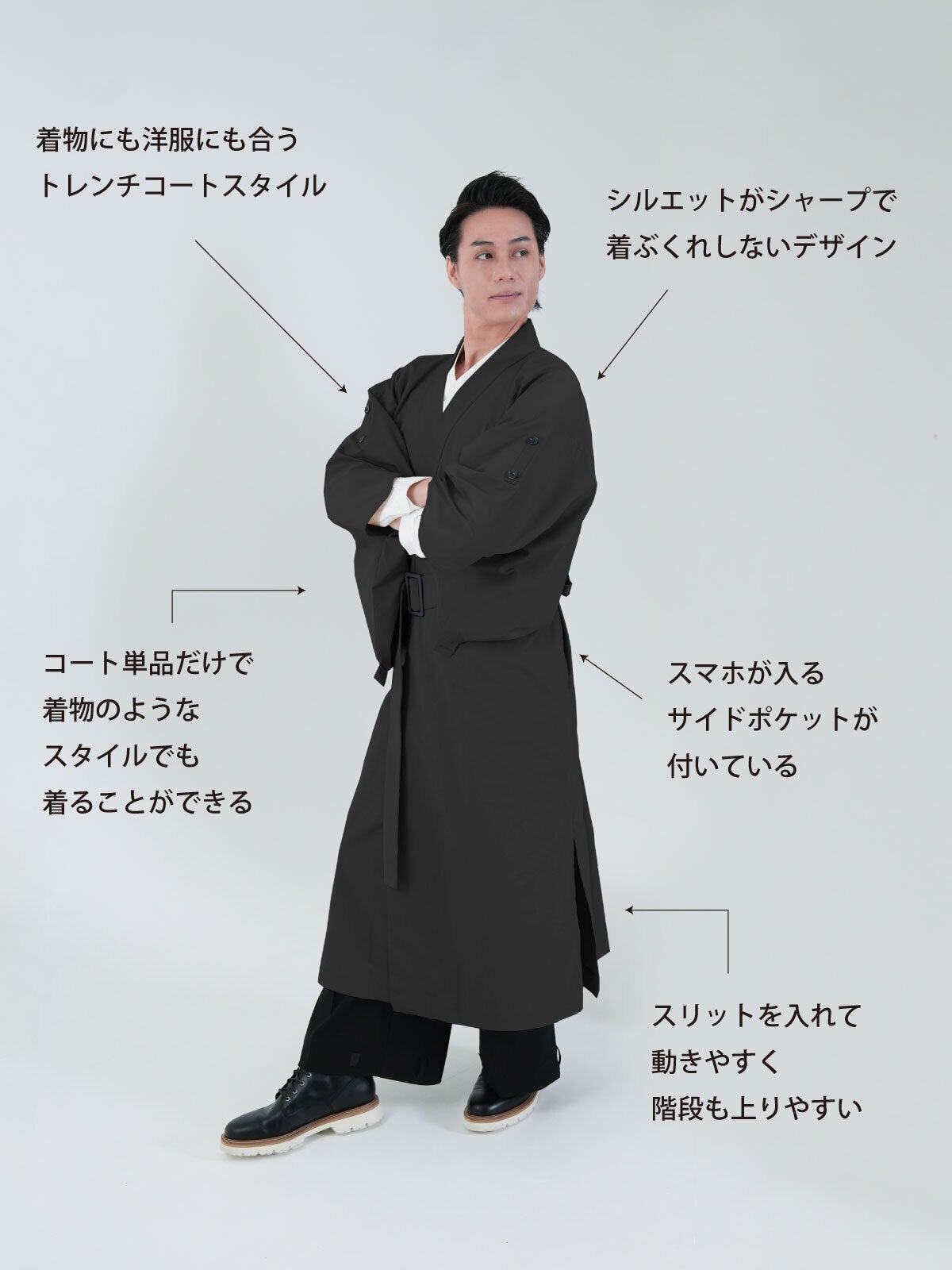 着物なのにフォーマルなスーツにも合わせることが出来る和洋の融合したデザインのKUDENの着物トレンチコート。
