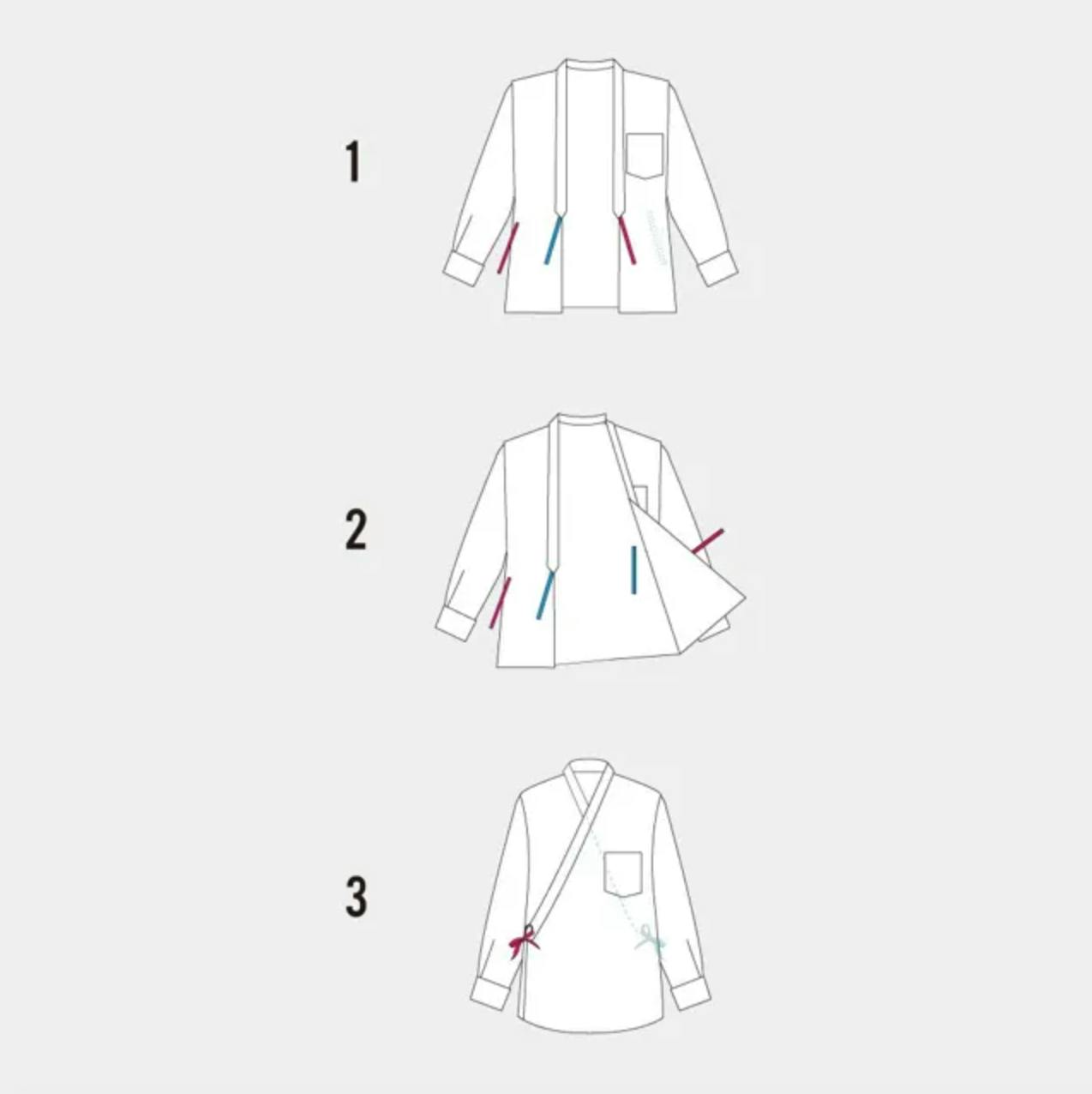 腰回りで留める二箇所の紐で調節することにより 伝統的なkimonoに比べ、締め付けが少ない快適な着心地を生み出します。
