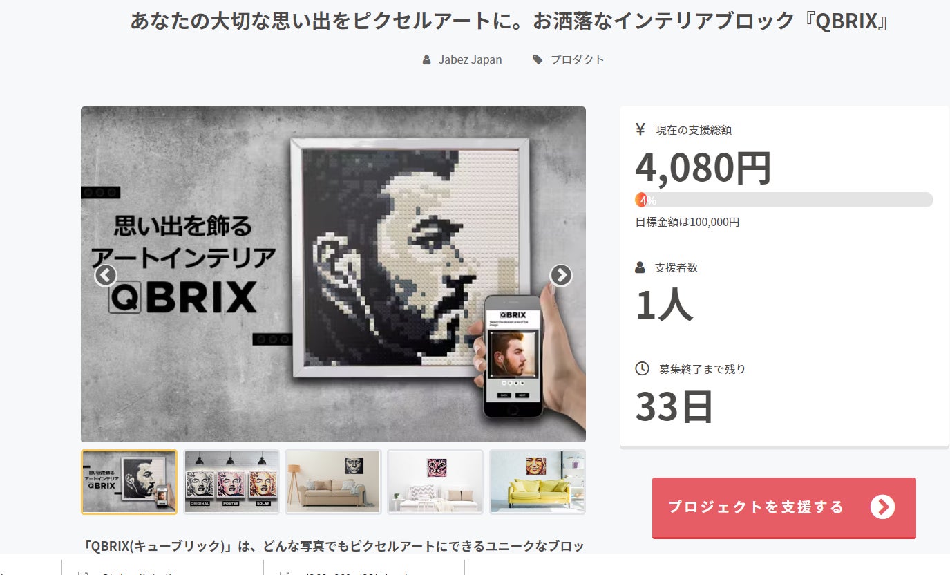 皆さま、こんにちは。ヤベツジャパンです。本日、ピクセルアートブロック「QBRIX(キューブリック)」 プロジェクトをオープンいたしました!!家族やペット、旅先での思い出など・・ とっておきの写真はありますか??お気に入り写真を自分でピクセルアートにして飾れる「QBRIX(キューブリック)」どの写真にしようか・・ピクセルアートを完成するまでもドキドキしますね。「QBRIX(キューブリック)」 であなただけのインテリアを作り上げてみてください!製品について気になる点などございましたら、お気軽にお問い合わせくださいませ。一人でも多くの方々に応援いただけるようプロジェクト終了まで頑張ってまいります。引き続きよろしくお願いいたします。