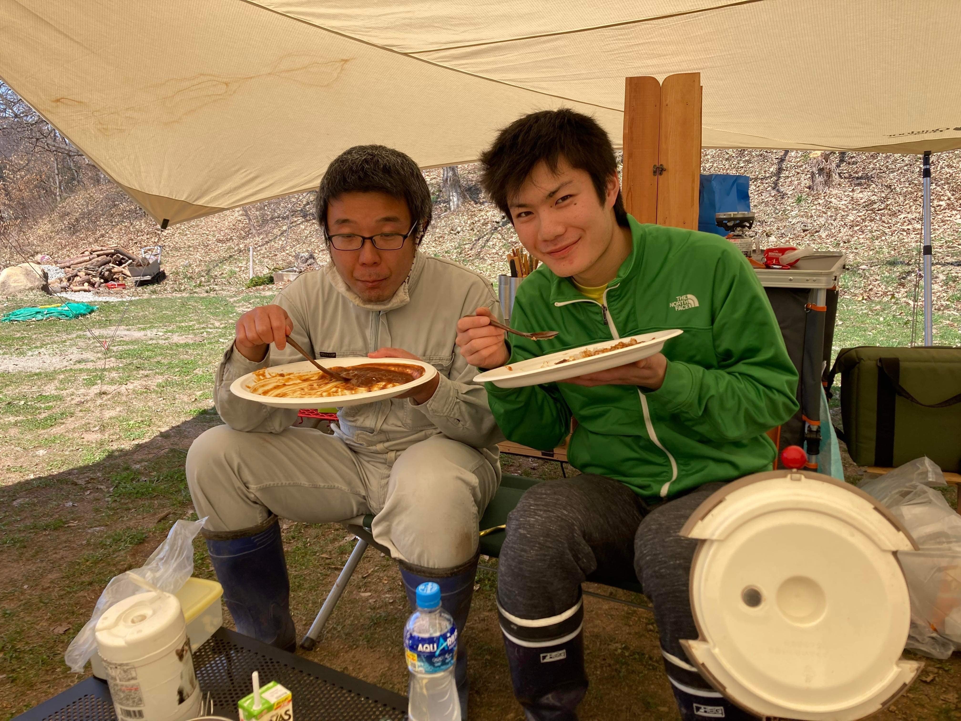 狩野さん夫婦とキャンプ仲間の方達が泊まっていて一緒に作業を行いました。日曜日の昼 食に、ハンバーグカレーをごちそうしてもらいました。天気も良く青空の下で食べる昼食は とてもおいしかったです。これがキャンプの醍醐味なのだと感じました。