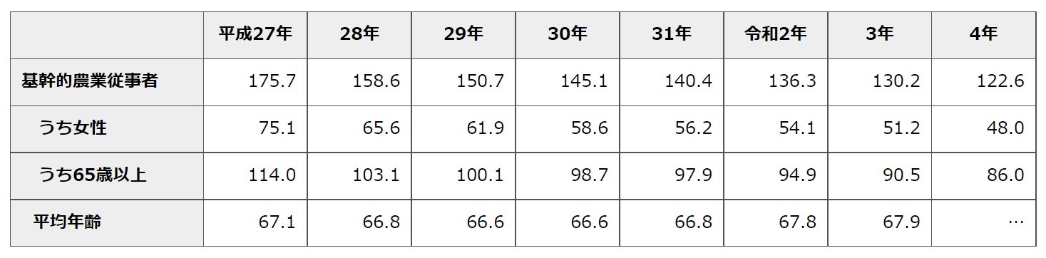 (注1)農林水産省の調査によれば、自営農家(基幹的農業従事者)の数は最新のデータ(令和3年)で130.2万人(平成27年比-45.5万人)、平均年齢は67.9歳でした。農家の担い手不足、そして高齢化がますます進んでいます。