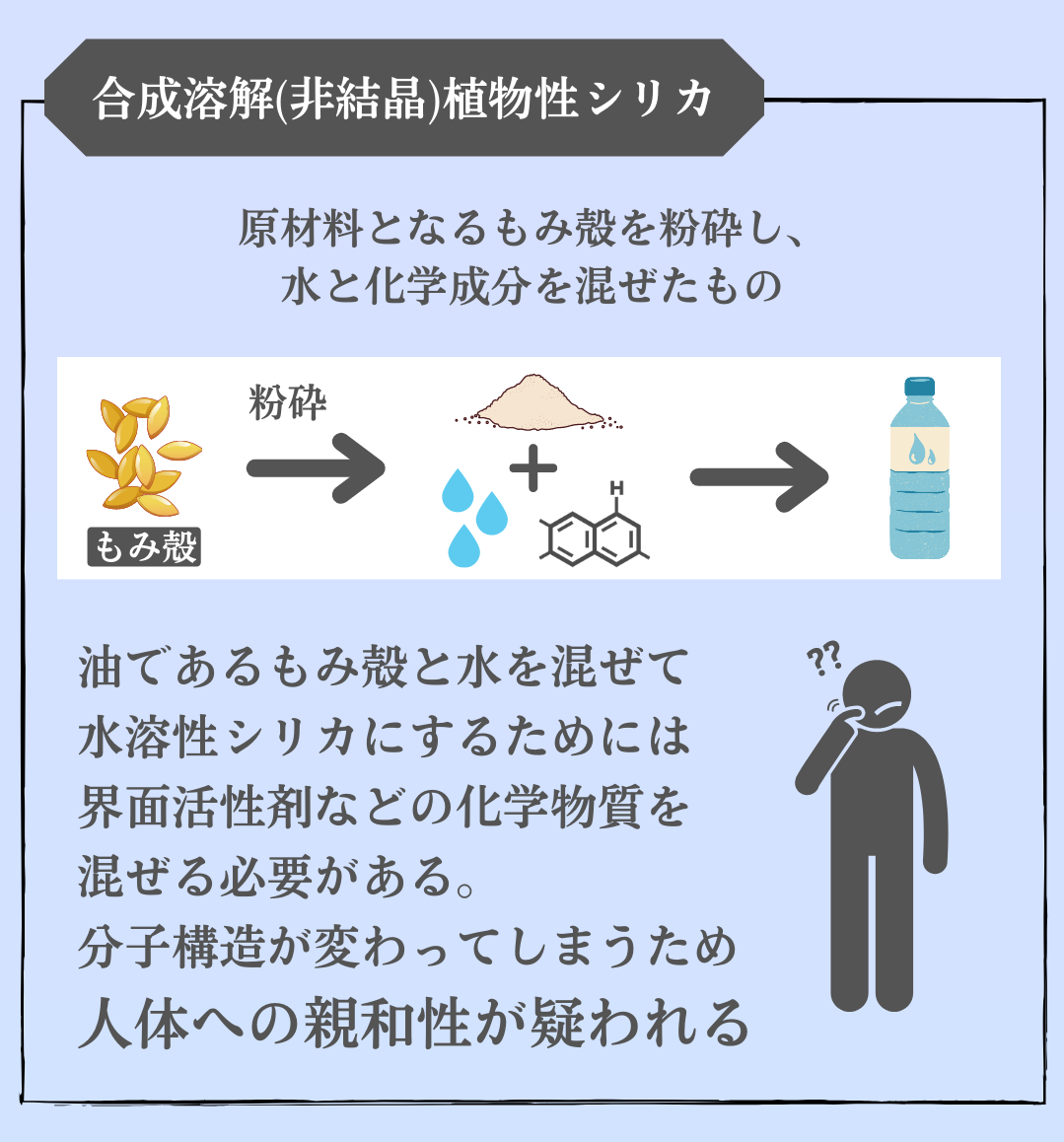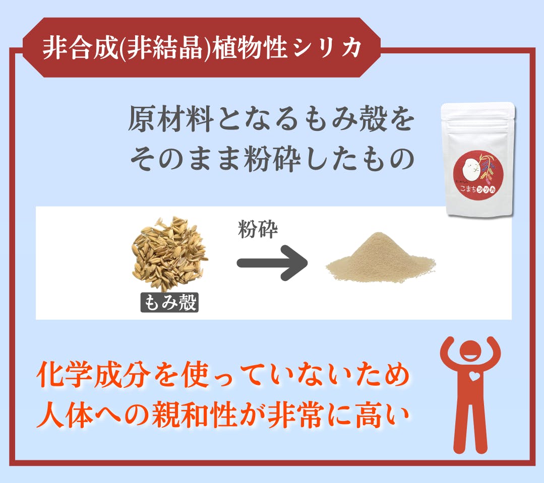 研究の中で分かったことは、植物性かつ非合成(化学物質不使用)のシリカがカラダへフィットしやすく、親和性があるということ。これが良いシリカの定義です。