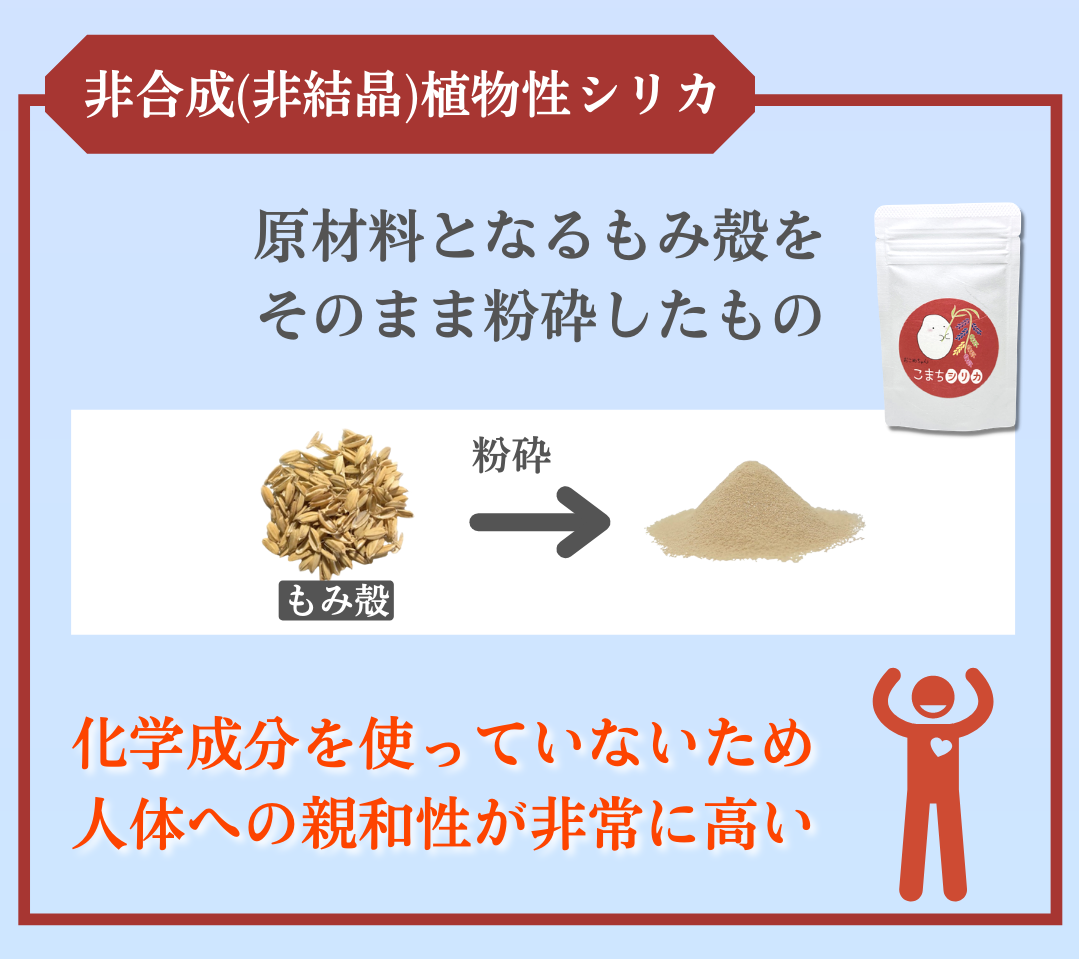 率直に言いますと、こまちシリカにはこだわりにこだわりを重ねたもみ殻しか使っていません!